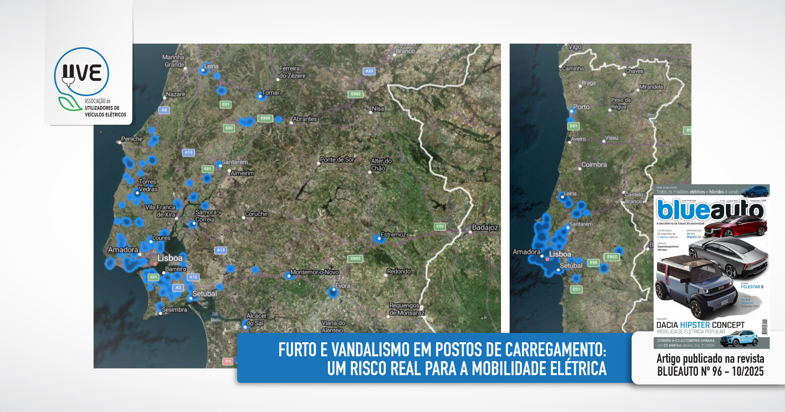 Artigo da UVE – Associação de utilizadores de Veículos Elétricos, publicado na edição nº 96 da revista Blueauto de outubro de 2025, sobre os casos de furto e vandalismo em Postos de Carregamento registados em Portugal desde abril deste ano.