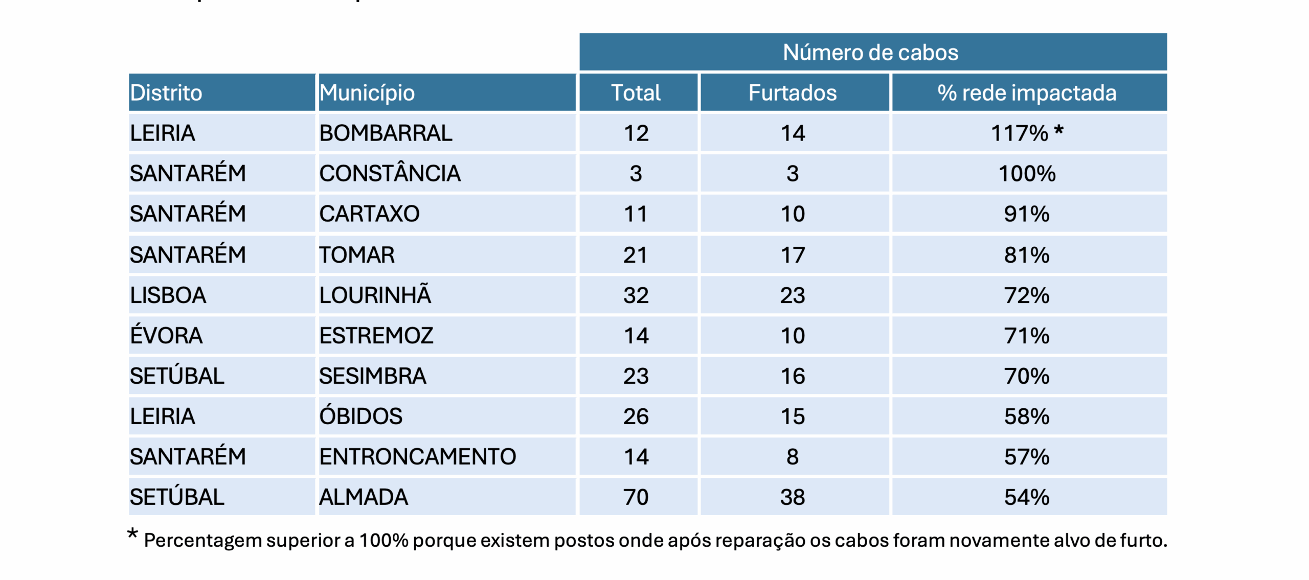 Desde agosto de 2025, o número de cabos furtados tem crescido de forma acentuada. Apenas entre as semanas 35 e 40 (final de agosto a início de outubro), registaram-se mais de 450 incidentes, com destaque para os distritos de Lisboa, Santarém, Leiria, Setúbal e Évora.