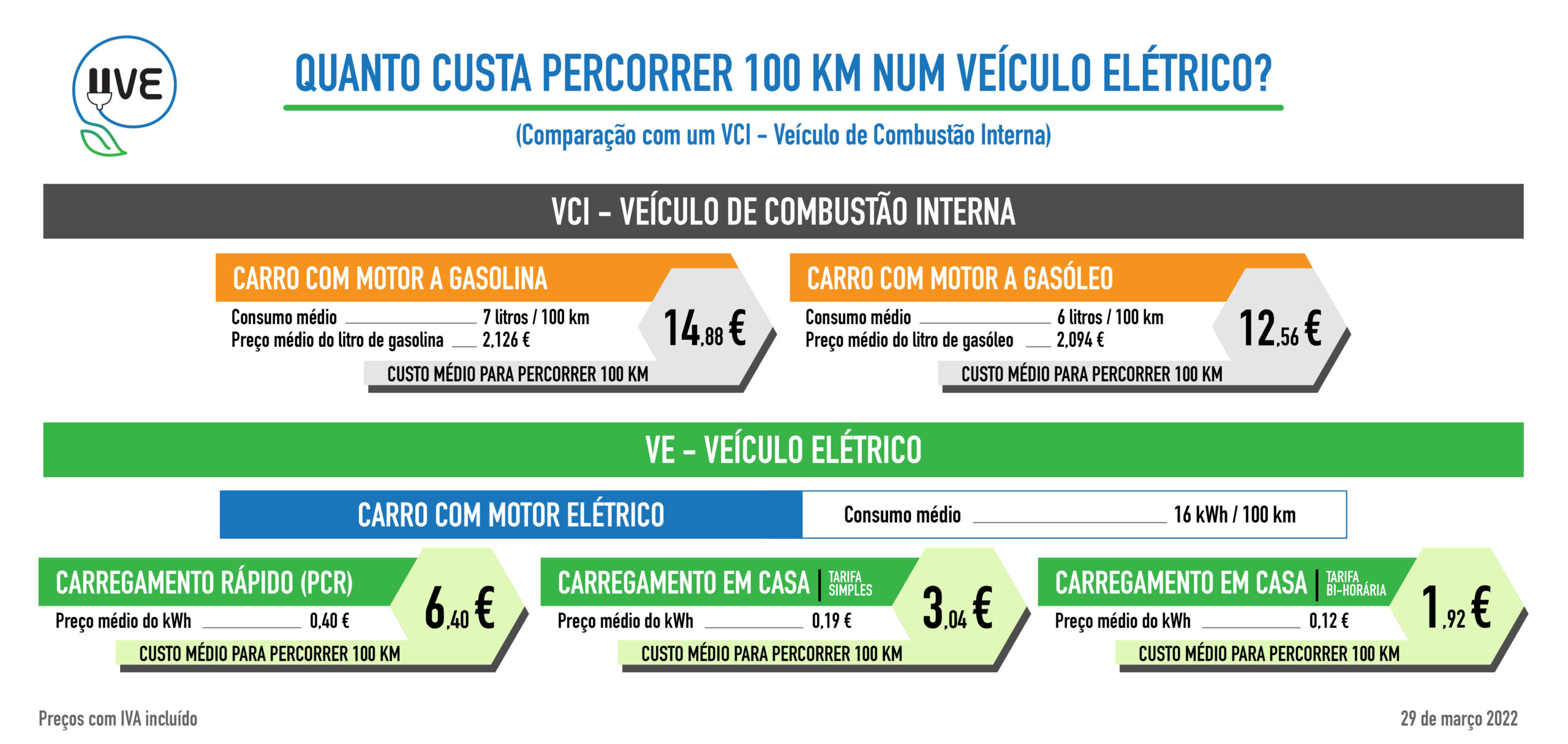 Comparação de custo para percorrer 100 km com veículos automóveis 100% elétricos vs. veículos automóveis com motores de combustão interna (gasolina e gasóleo).