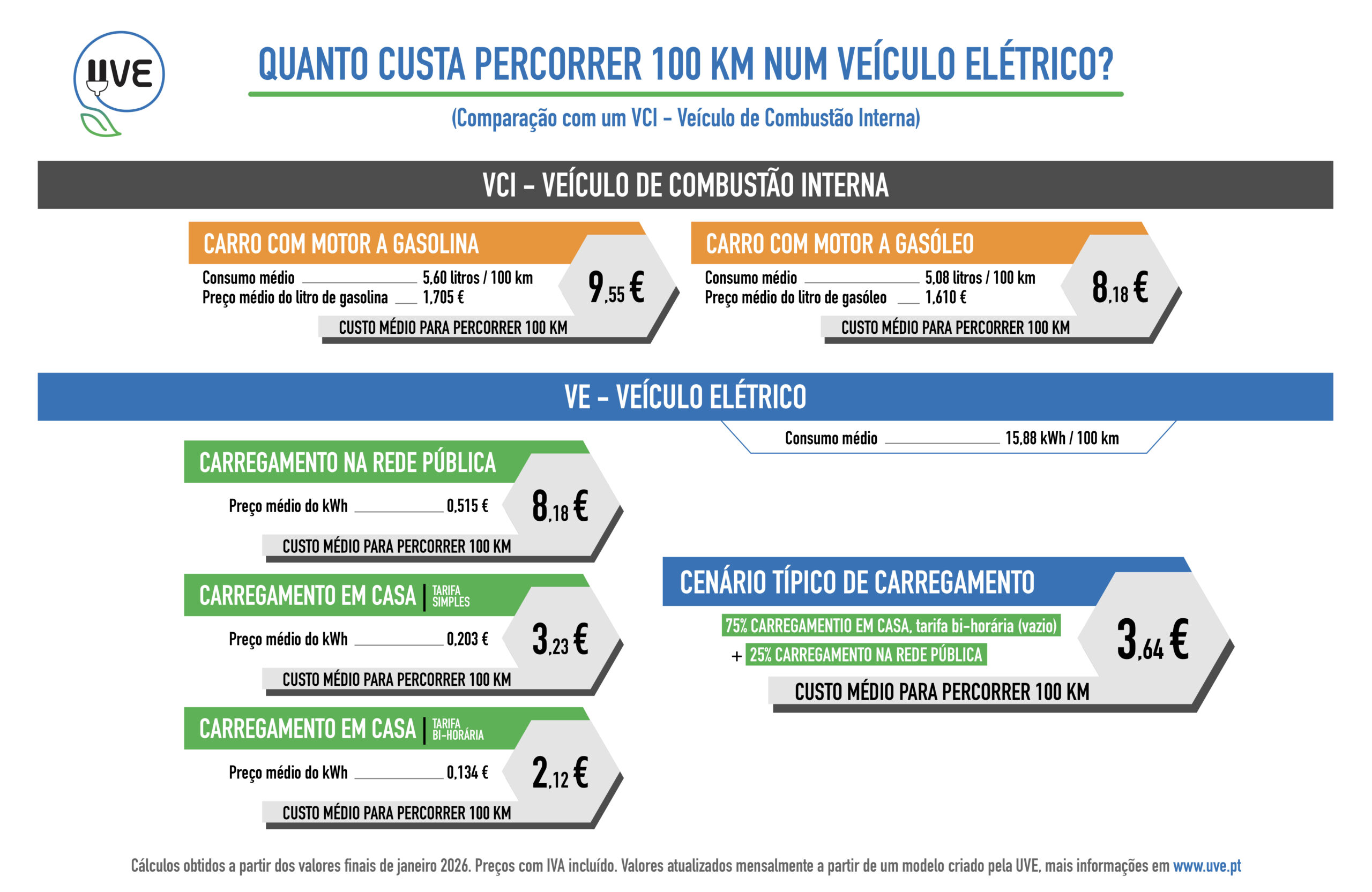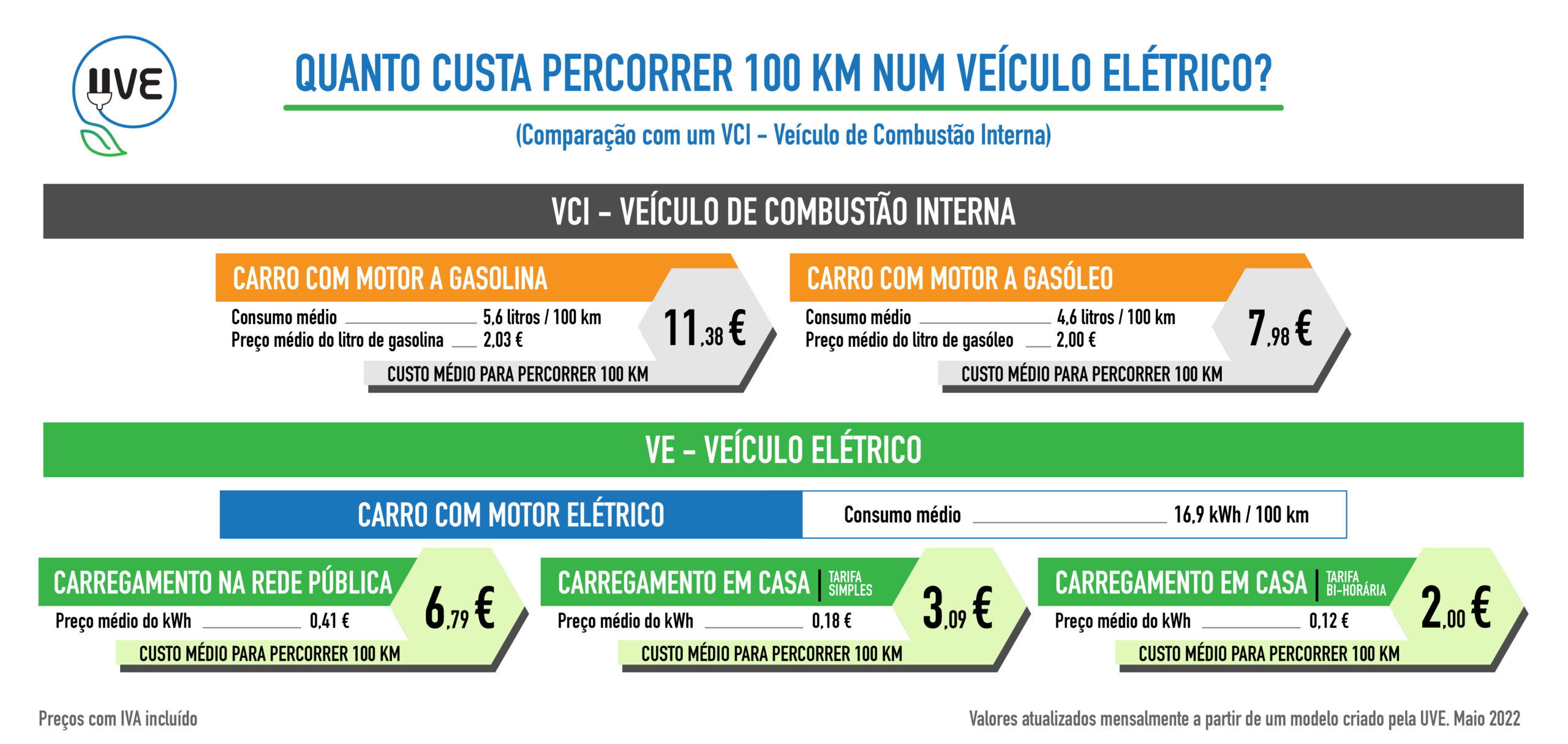 A UVE – Associação de Utilizadores de Veículos Elétricos criou um modelo de análise do custo para percorrer 100 km, entre os parâmetros analisados encontram-se os valores dos vários tipos de postos de carregamento em Portugal (na Rede Pública), carregamento em casa/condomínio (tarifa de eletricidade simples e bi-horária), tal como o consumo real dos vários modelos de veículos automóveis 100% elétricos em circulação em Portugal.