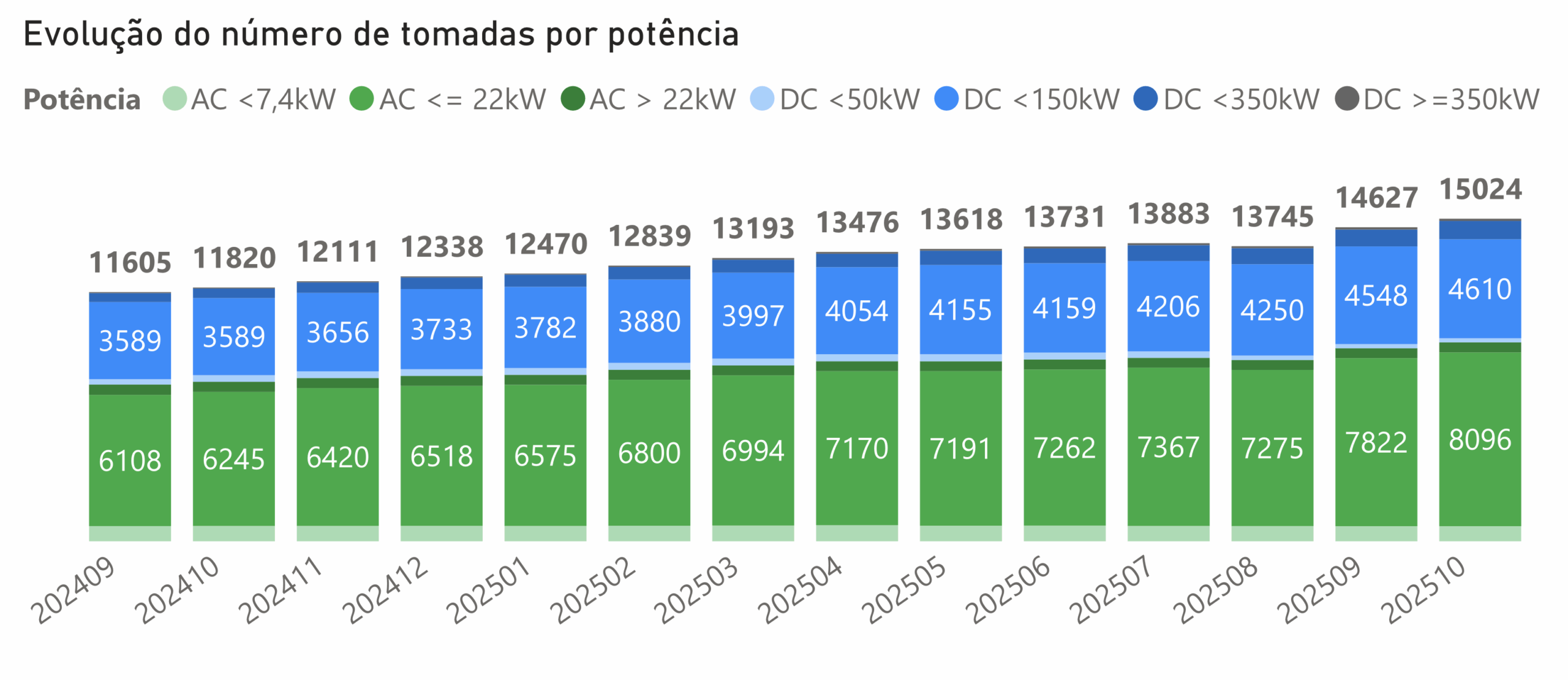 Em outubro, a rede de carregamento pública apresentou um crescimento do número de tomadas, em mais de 2,7% face ao mês anterior, tendo já ultrapassado as 15.000 unidades. Contudo, apesar deste aumento, o número de tomadas CHAdeMO existentes na rede tem diminuído desde maio de 2025 (-1,5%).