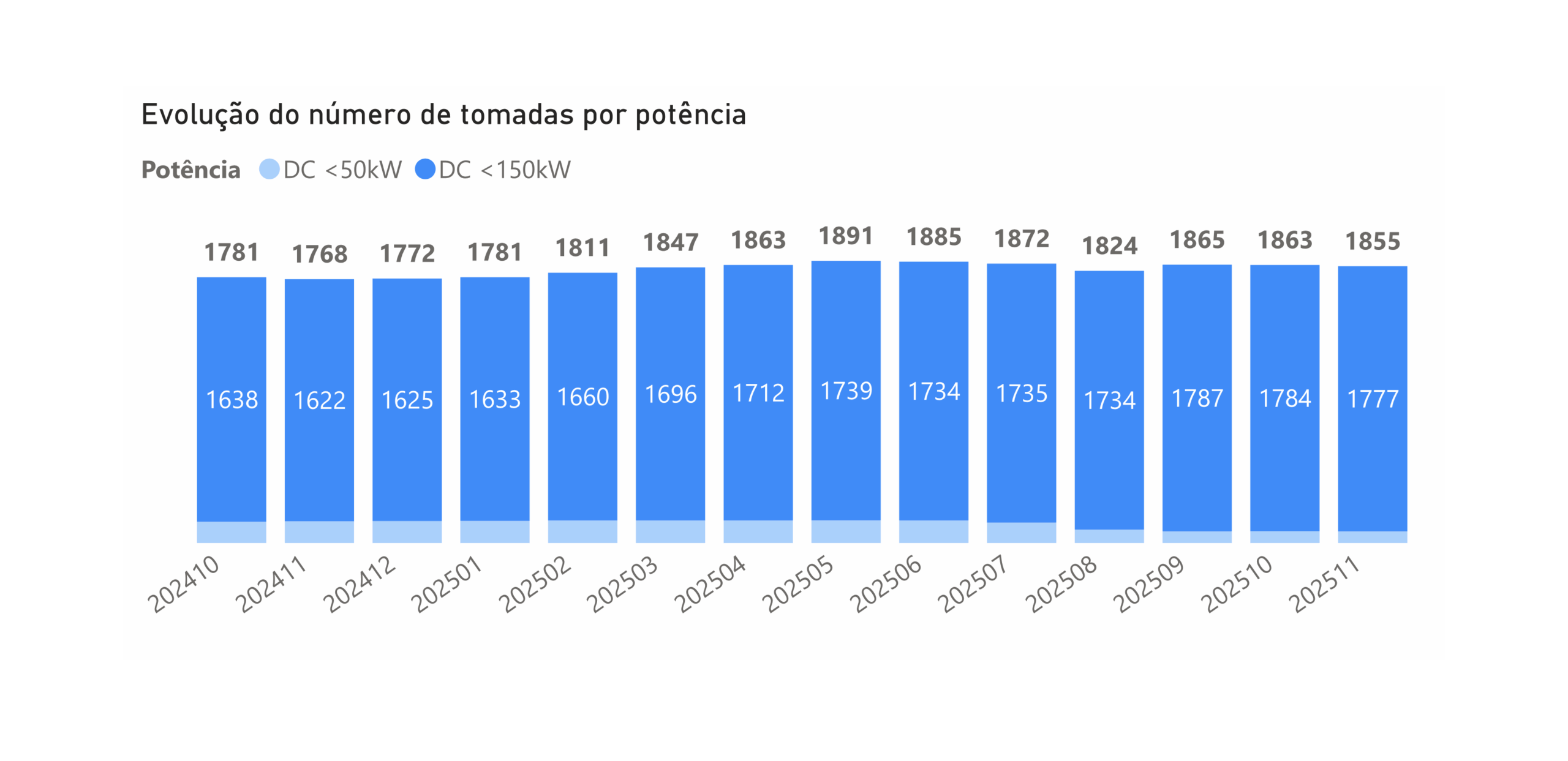 Em novembro, a rede de carregamento pública apresentou um crescimento do número de tomadas, em mais de 2,7% face ao mês anterior, tendo já ultrapassado as 15.400 unidades. Contudo, apesar deste aumento, o número de tomadas CHAdeMO existentes na rede tem diminuído desde maio de 2025 (-2%).