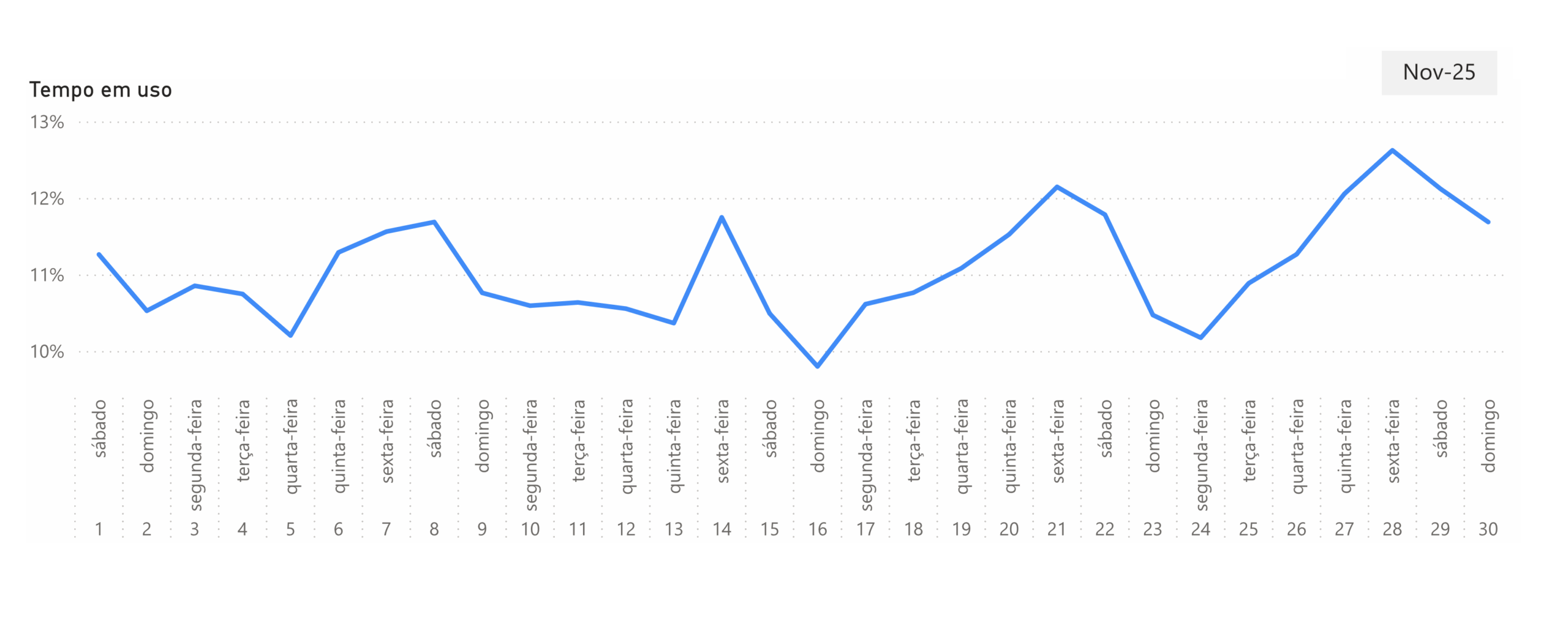No mês de novembro, os dias com maiores taxas de utilização da rede foram sistematicamente as sextas-feiras, com valores superiores a 11,6%, tendo sido atingido um máximo de 12,6% no passado dia 28 de novembro.