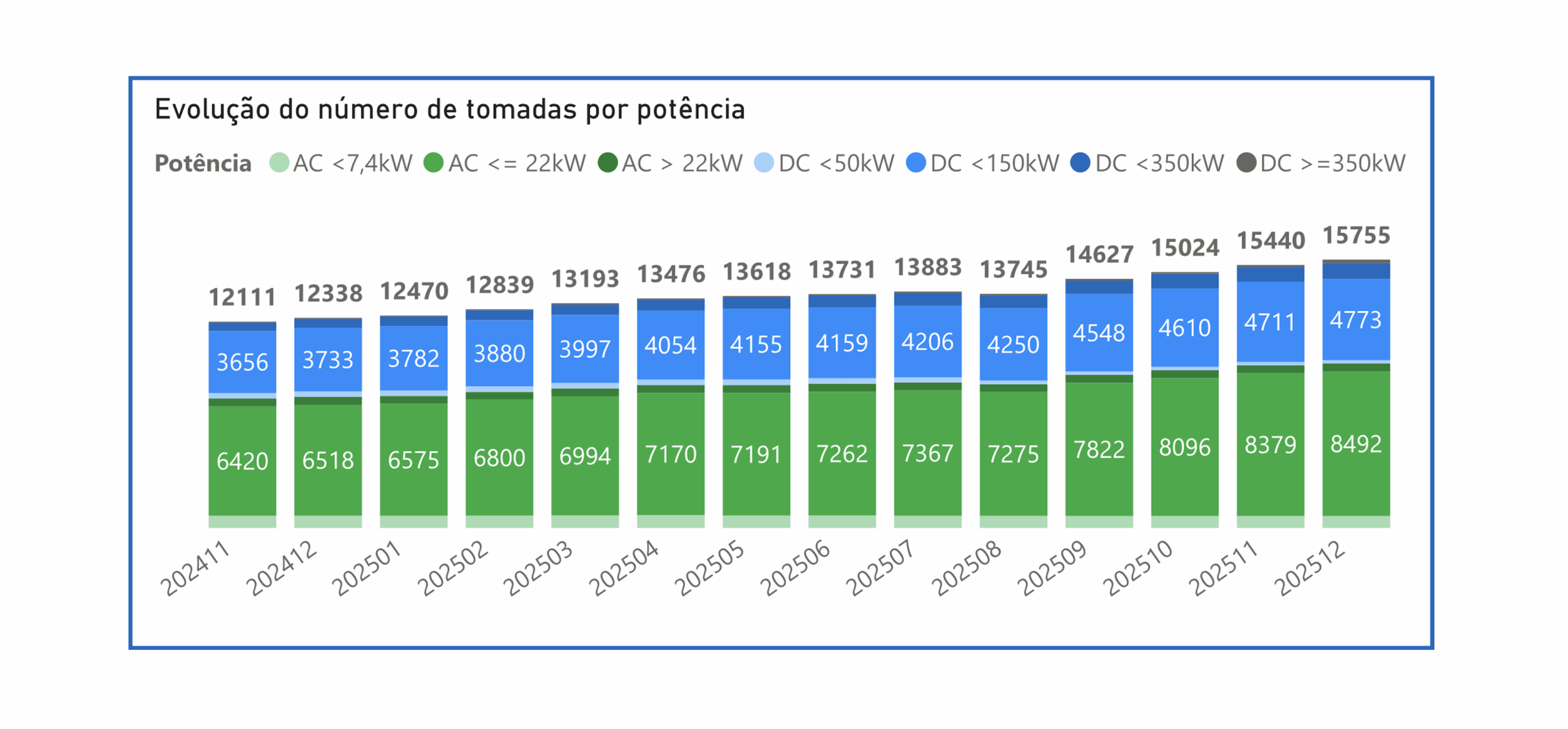 Em dezembro, a rede de carregamento pública apresentou um crescimento do número de tomadas, em mais de 2% face ao mês anterior, tendo já ultrapassado as 15.700 unidades. Este crescimento foi de 1% nas tomadas Tipo 2 (Mennekes) e de 5% nas tomadas CC2 usadas em carregamentos rápidos.