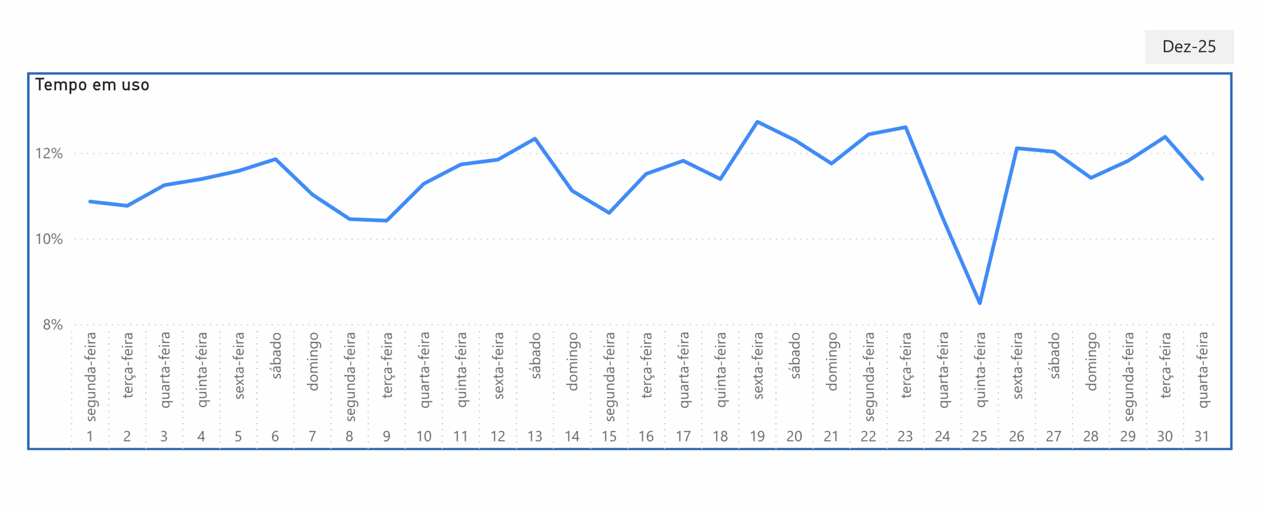 No mês de dezembro, os dias com maiores taxas de utilização da rede foram as sextas-feiras e os sábados, com valores superiores a 12%, tendo sido atingido um máximo de 12,7% na sexta-feira dia 19 de dezembro. No extremo oposto, o dia de Natal foi o dia do mês com menor taxa de utilização da rede (8,5%).