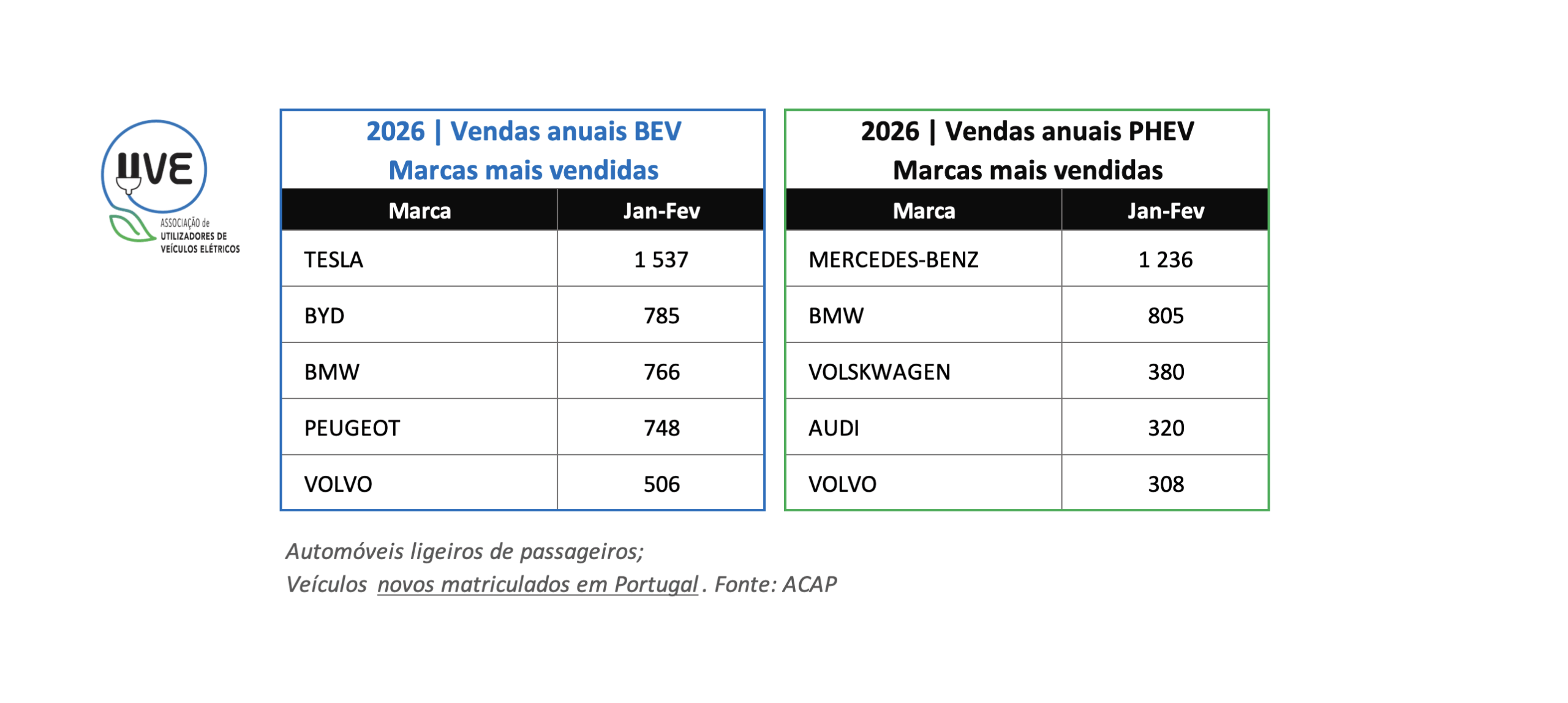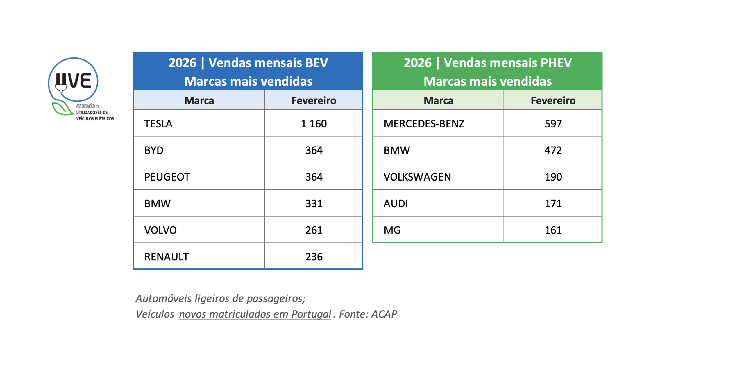 Top das marcas de veículos ligeiros de passageiros, 100% elétricos (BEV – Battery Electric Vehicle) e híbridos plug-in (PHEV – Plug-In Hybrid Electric Vehicle), novos, matriculados em Portugal no mês de fevereiro de 2026.