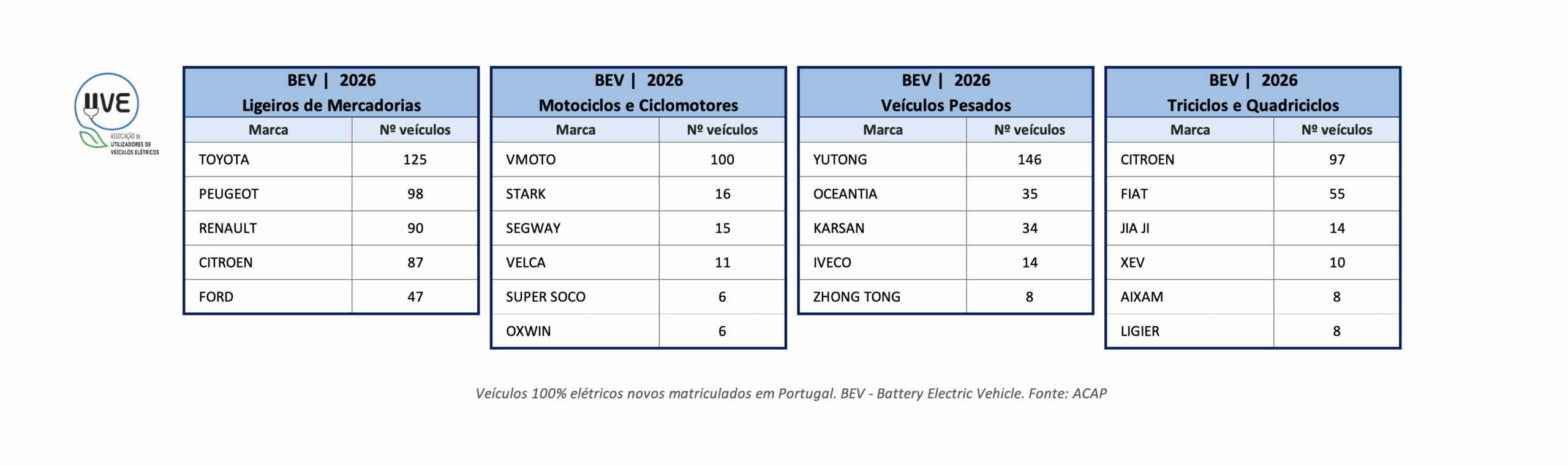Top de marcas de veículos novos ligeiros de mercadorias, veículos pesados de mercadorias e/ou passageiros, motociclos e ciclomotores e triciclos e quadriciclos 100% elétricos (BEV – Battery Electric Vehicle), matriculados em Portugal em 2026.