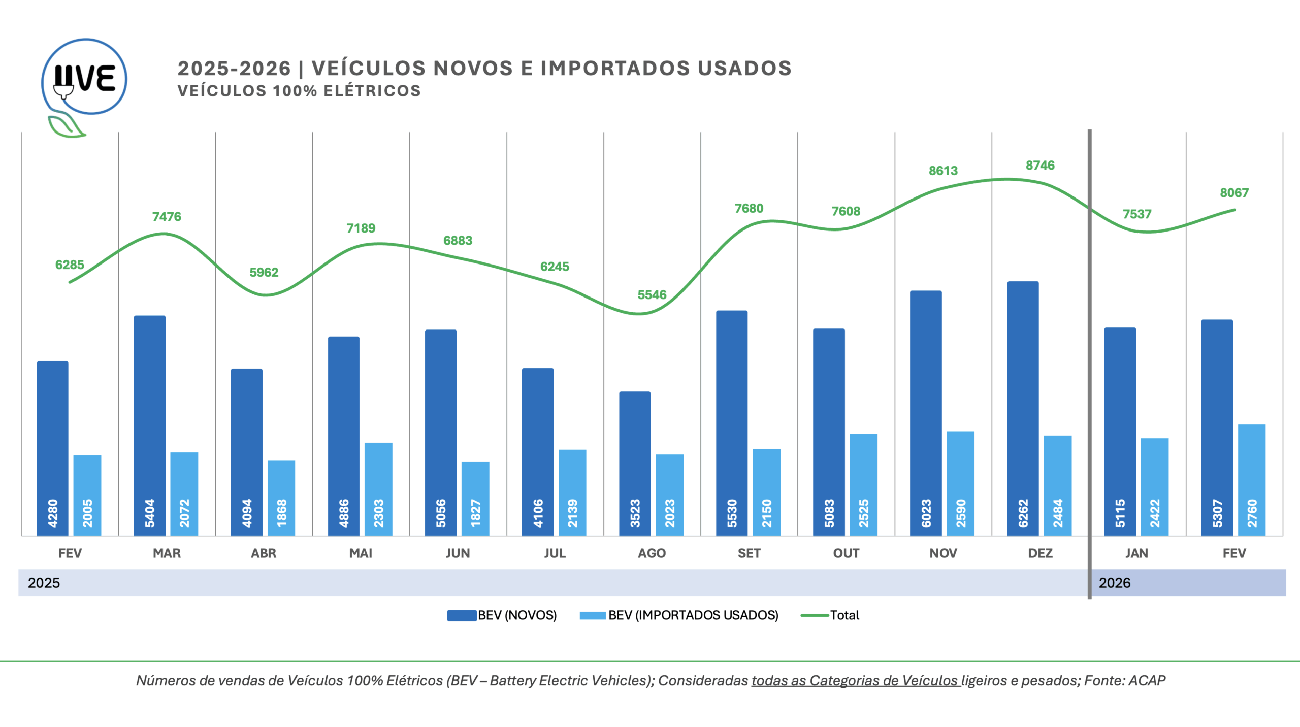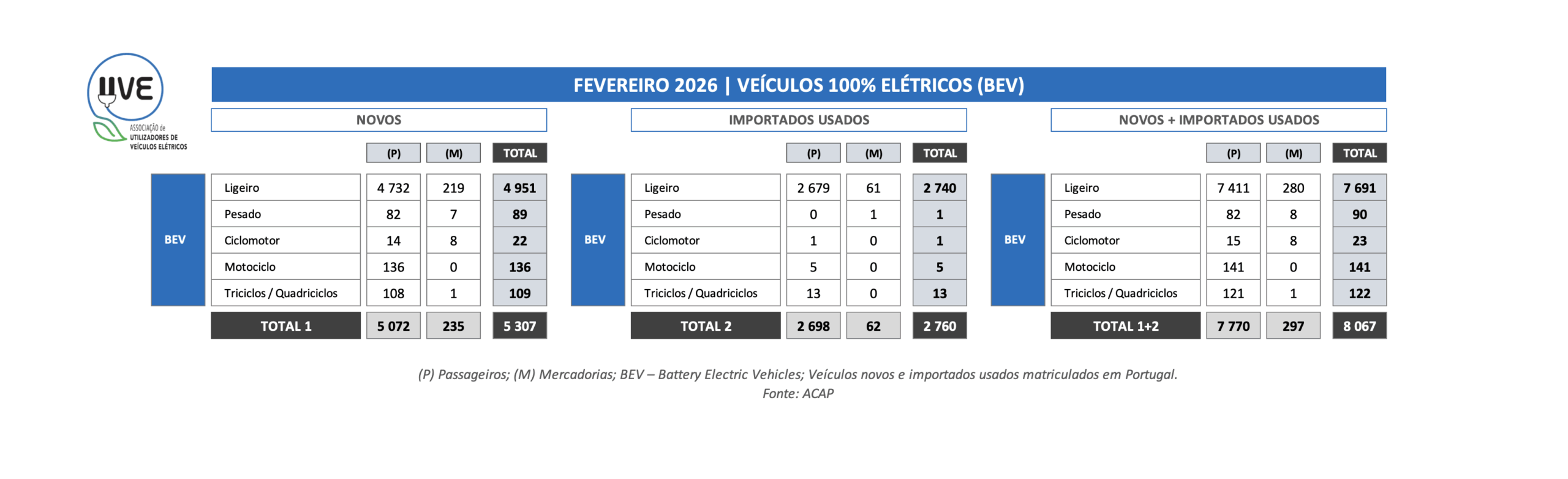 Veículos 100% elétricos (BEV – Battery Electric Vehicle) de todas as categorias, novos e importados usados, matriculados durante o mês de fevereiro em Portugal. Total de 8.067, dos quais 5.307 correspondem a veículos novos e 2.760 de veículos importados usados.