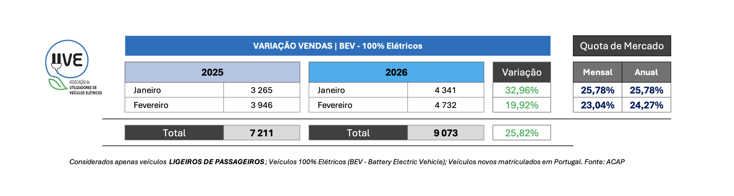 Em termos de variação homóloga (relativa a fevereiro de 2025), o mercado de veículos 100% elétricos em Portugal registou um crescimento de 33,55% – considerando todas as categorias de veículos novos e importados usados. Os veículos 100% elétricos novos cresceram 30,06% e os importados usados cresceram 41,16%.