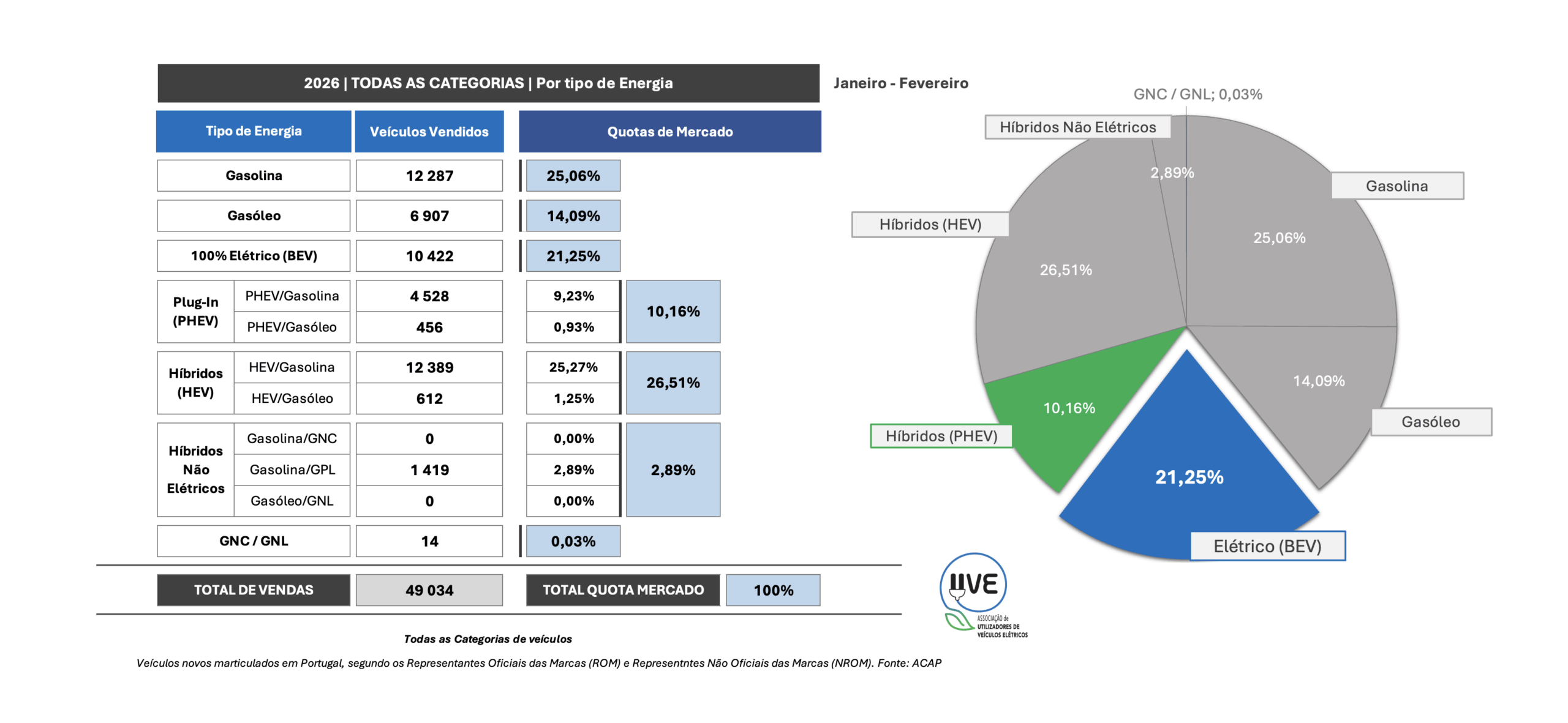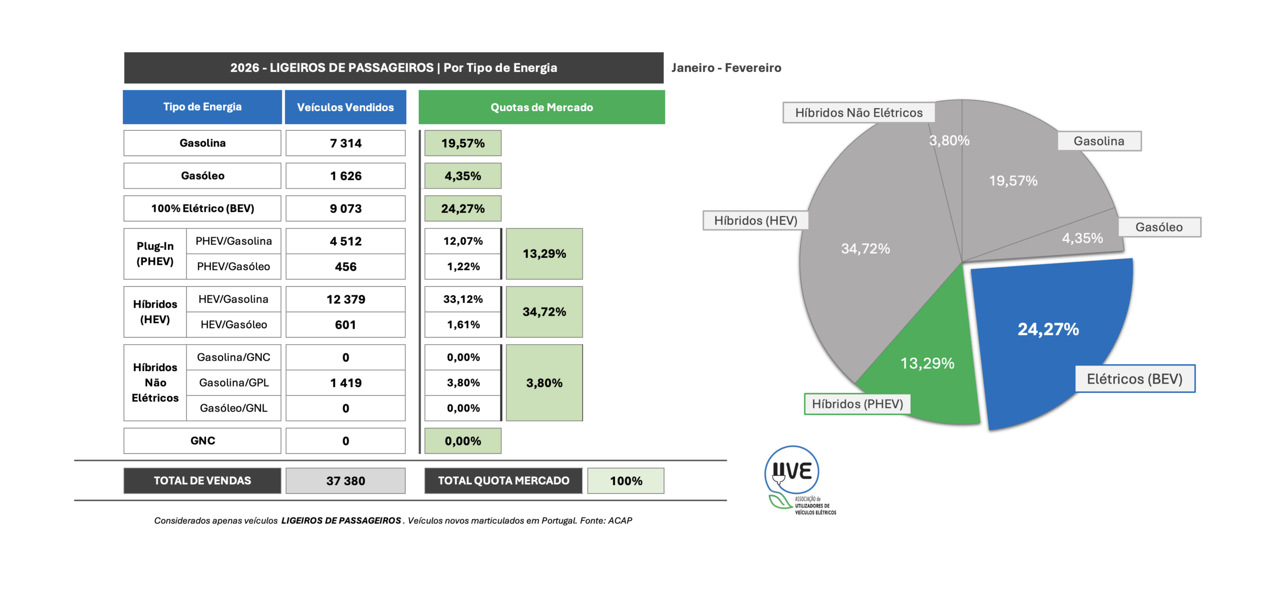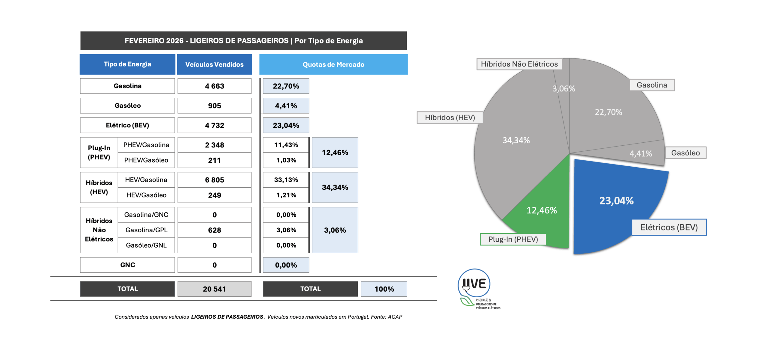 Todas as categorias de veículos, novos, por tipo de energia, matriculados em Portugal em fevereiro de 2026 e a respetiva quota.