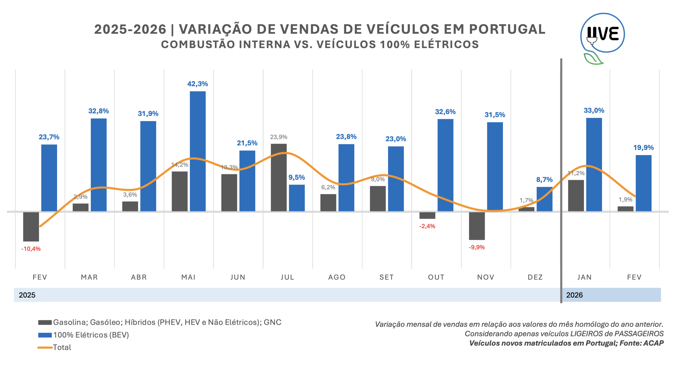 Comparação entre a variação mensal de vendas, dos veículos ligeiros de passageiros, novos, matriculados em Portugal, segundo o tipo de motorização (veículos com motor de combustão interna vs. veículos 100% elétricos).