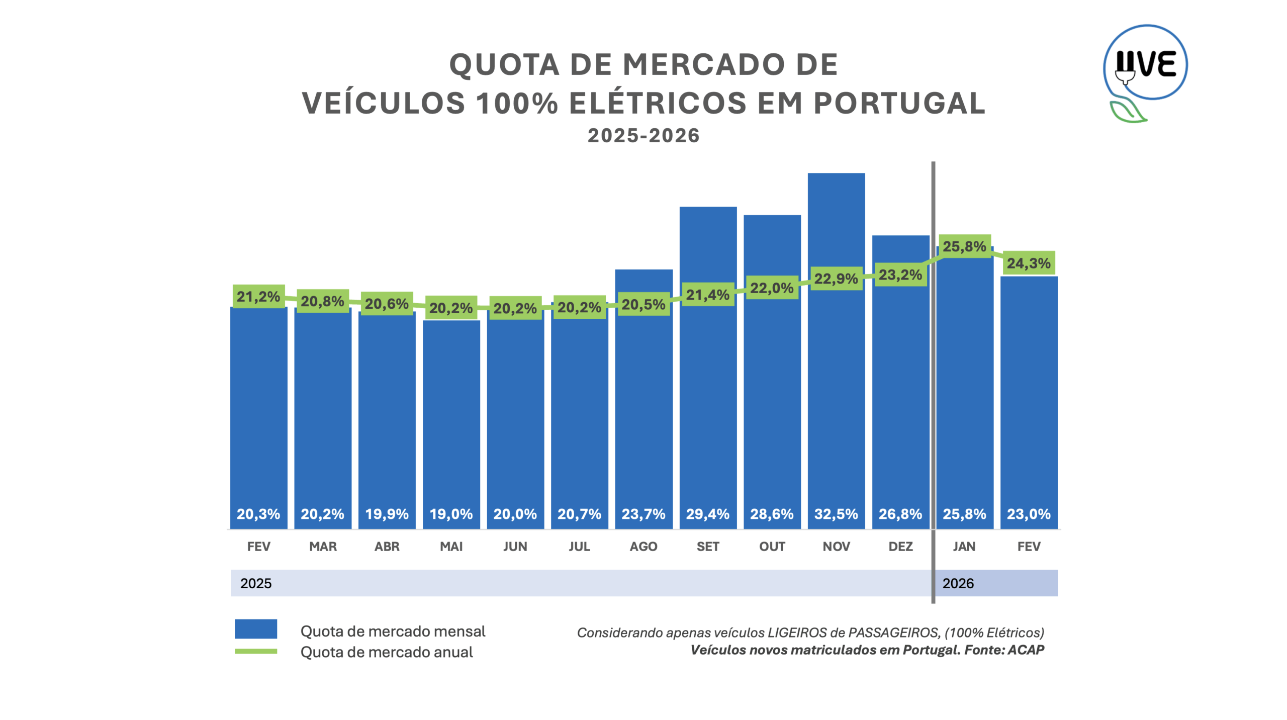 Evolução da quota mensal e anual de veículos ligeiros de passageiros, novos, 100% elétricos (BEV – Battery Electric Vehicle), matriculados em Portugal.