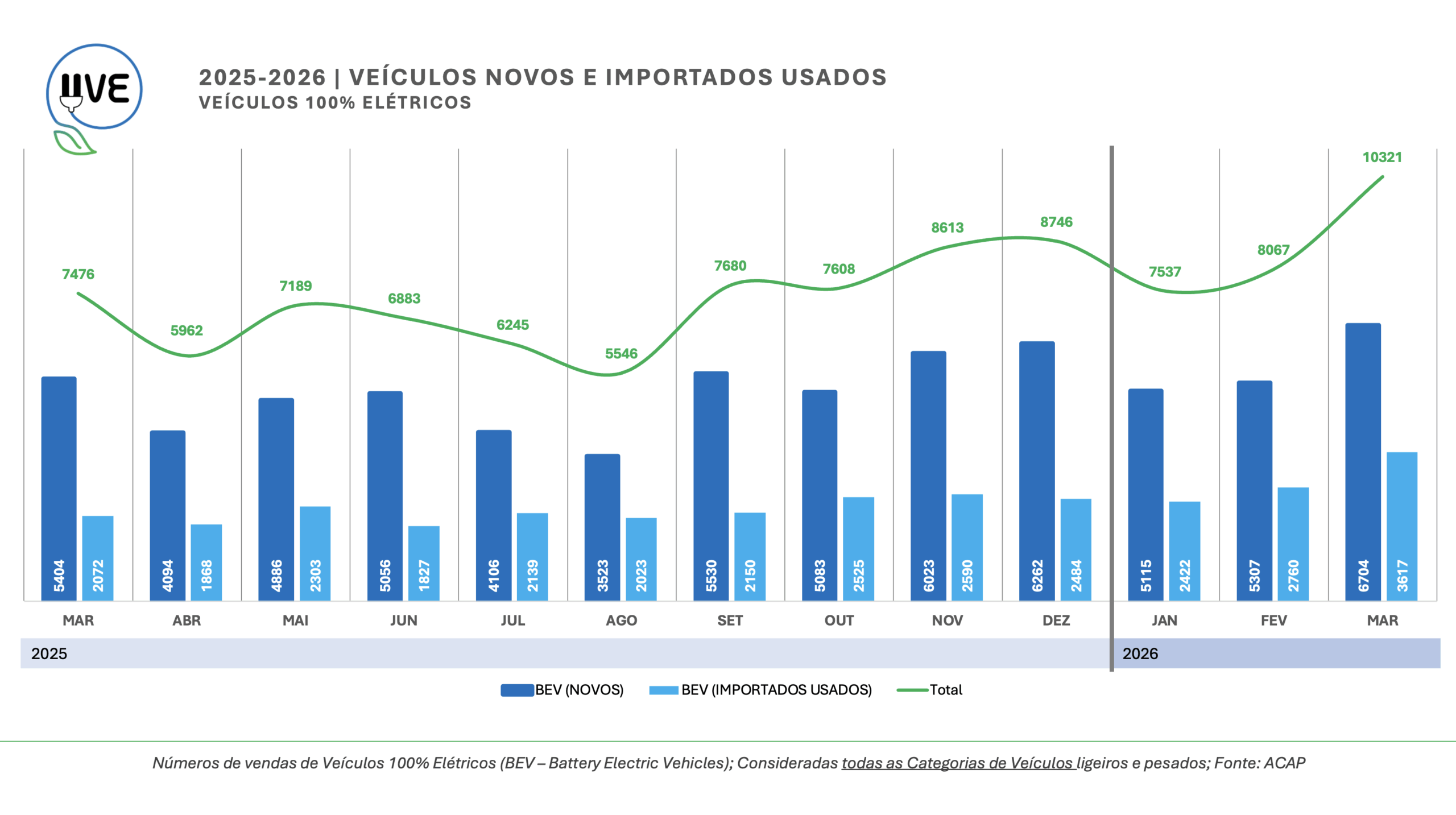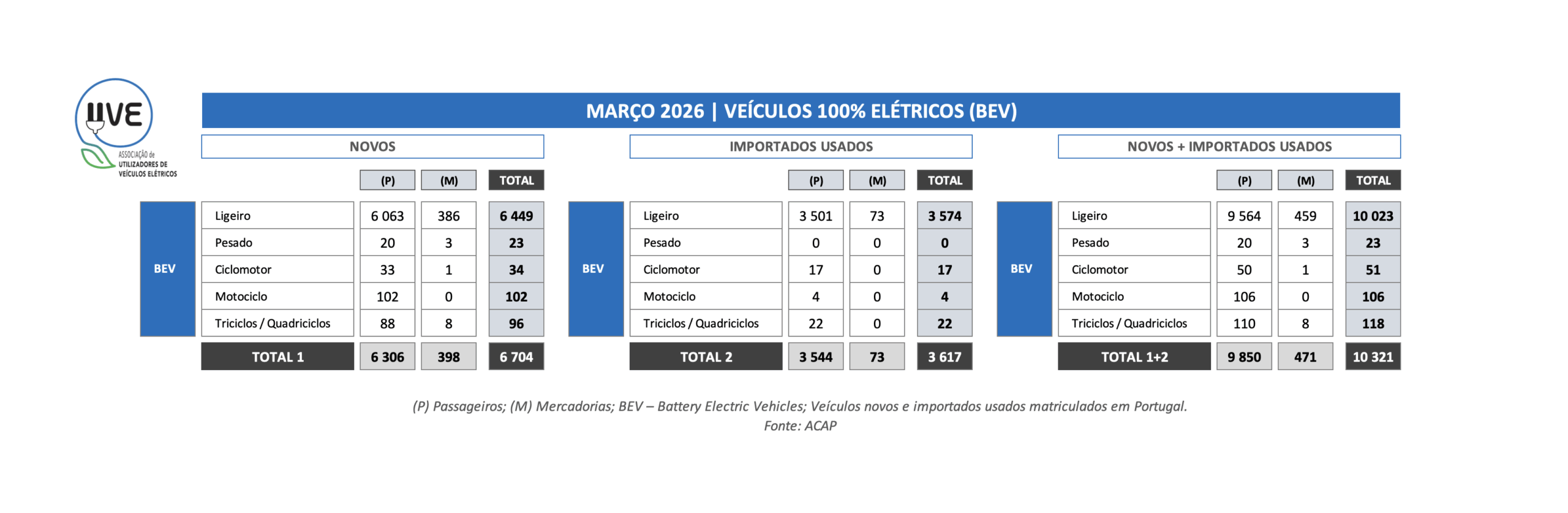 Veículos 100% elétricos (BEV – Battery Electric Vehicle) de todas as categorias, novos e importados usados, matriculados durante o mês de março em Portugal. Total de 10.321, dos quais 6.704 correspondem a veículos novos e 3.617 de veículos importados usados.