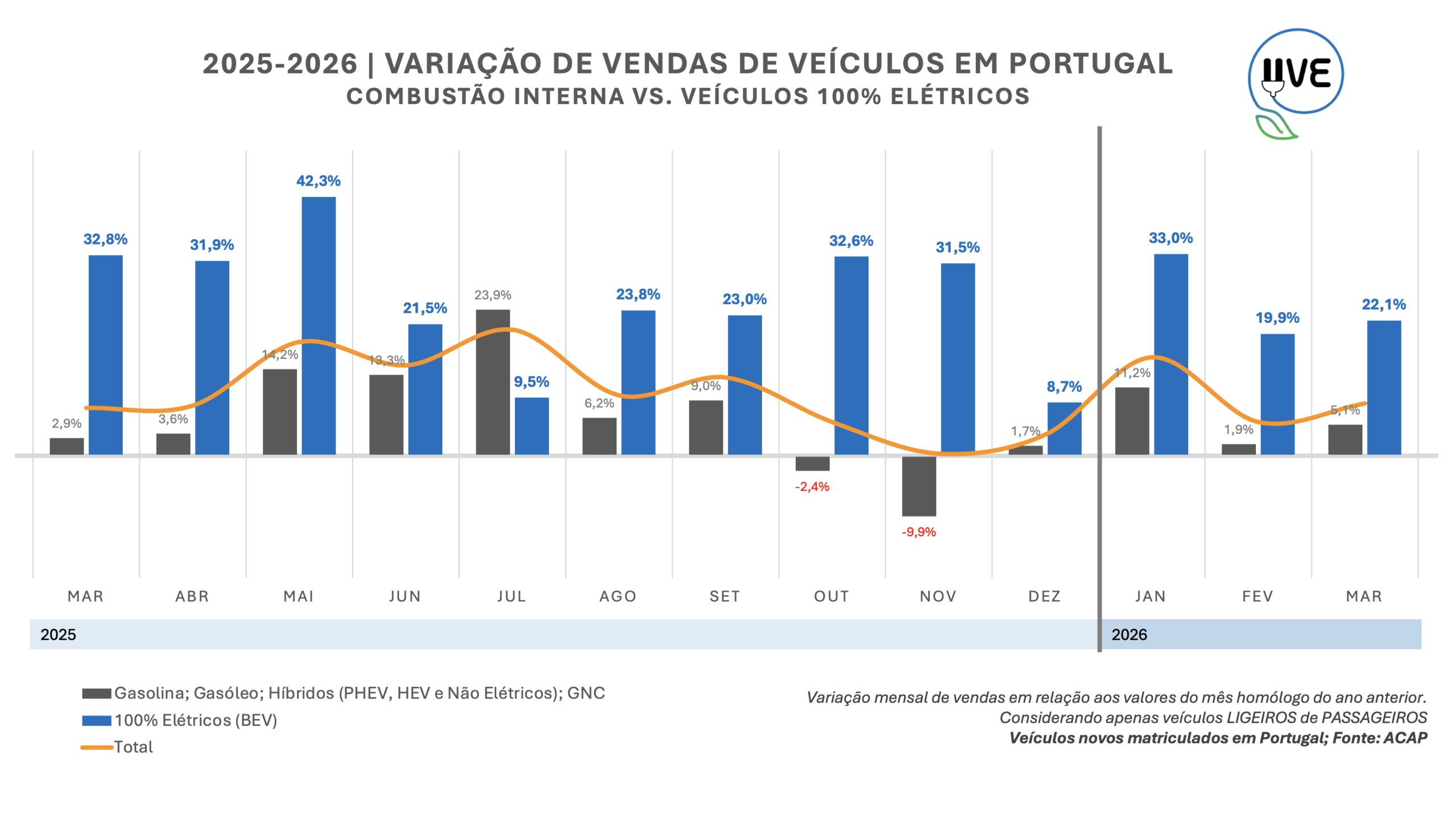Comparação entre a variação mensal de vendas, dos veículos ligeiros de passageiros, novos, matriculados em Portugal, segundo o tipo de motorização (veículos com motor de combustão interna vs. veículos 100% elétricos).