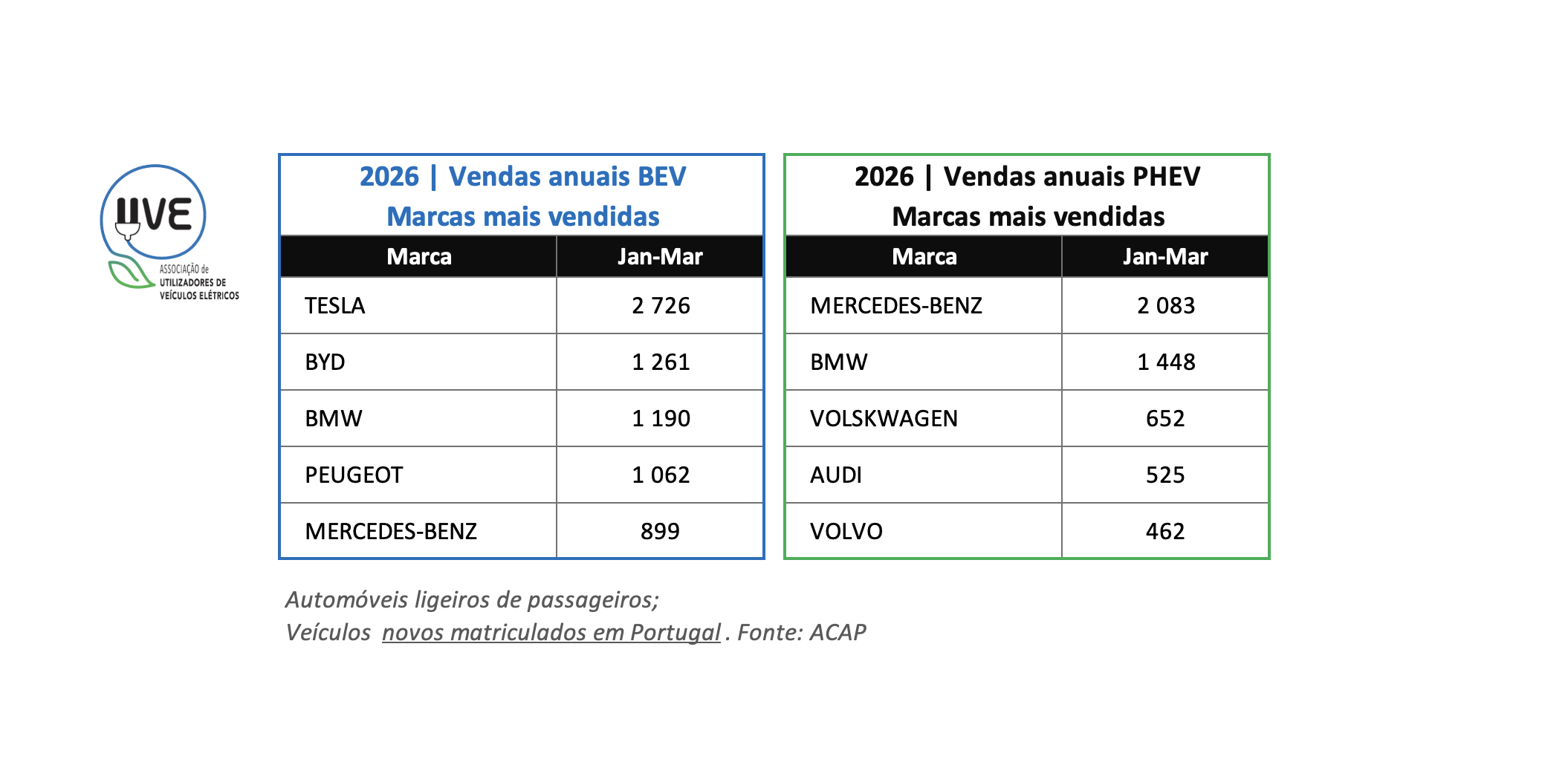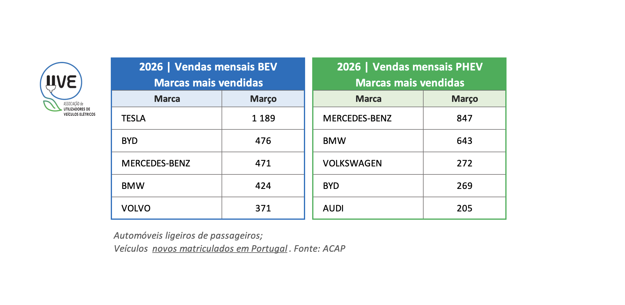 Top das marcas de veículos ligeiros de passageiros, 100% elétricos (BEV – Battery Electric Vehicle) e híbridos plug-in (PHEV – Plug-In Hybrid Electric Vehicle), novos, matriculados em Portugal no mês de março de 2026.