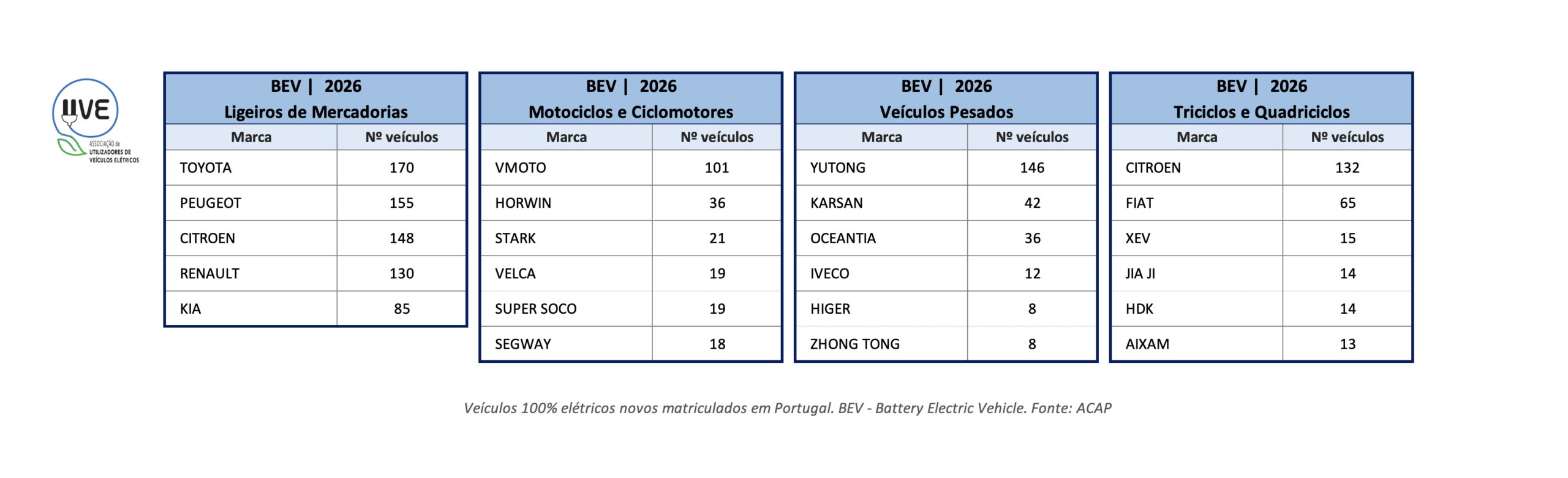 Top de marcas de veículos novos ligeiros de mercadorias, veículos pesados de mercadorias e/ou passageiros, motociclos e ciclomotores e triciclos e quadriciclos 100% elétricos (BEV – Battery Electric Vehicle), matriculados em Portugal em 2026.