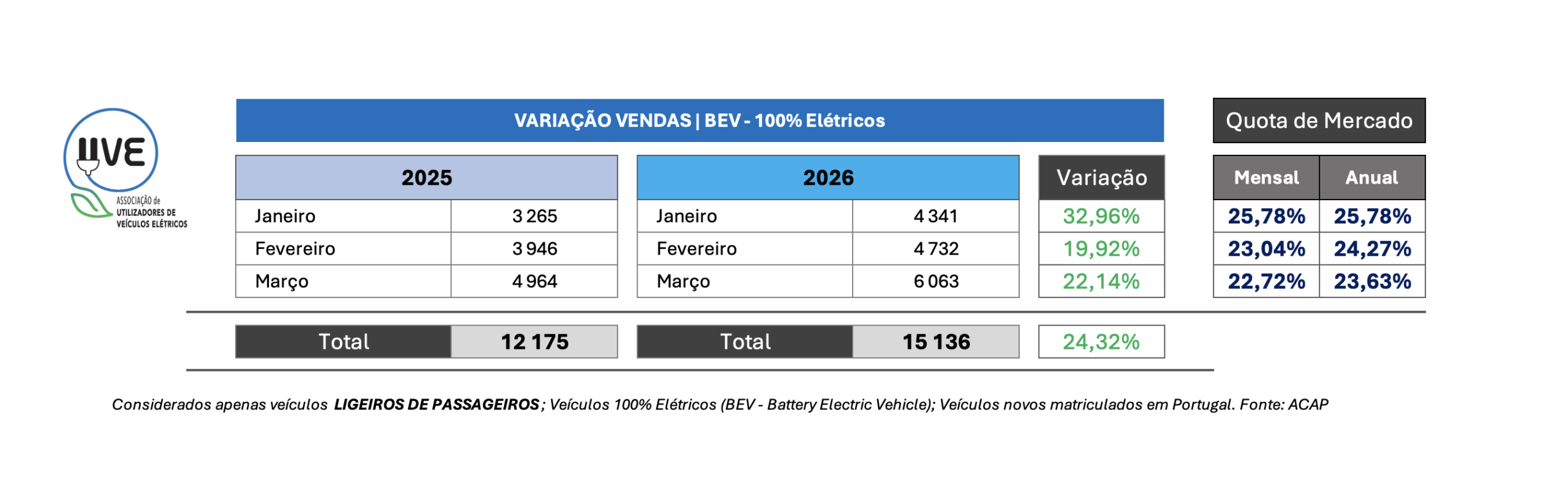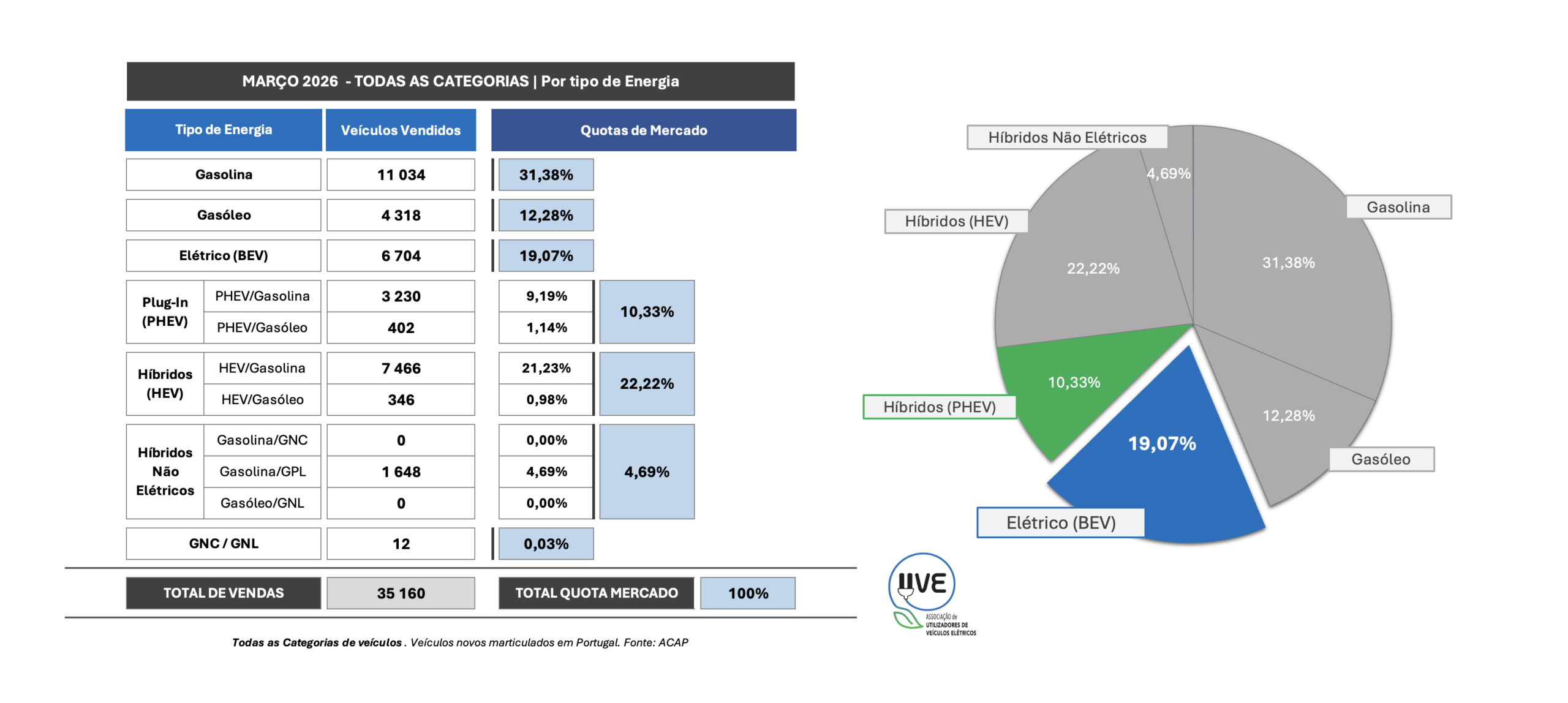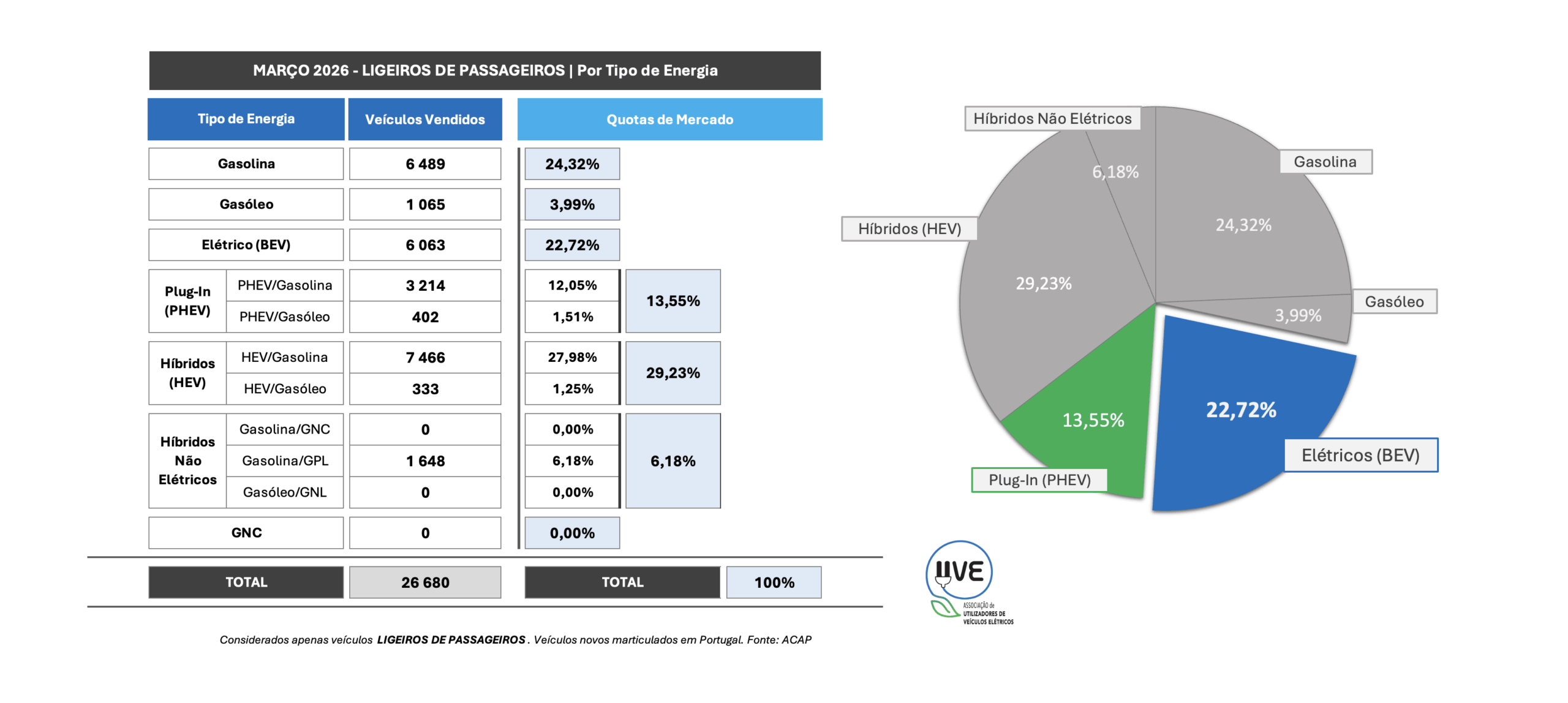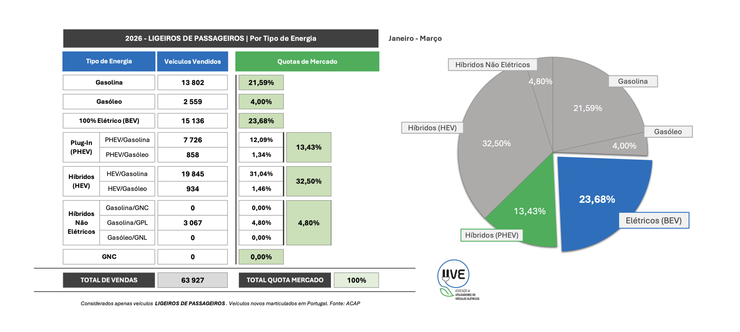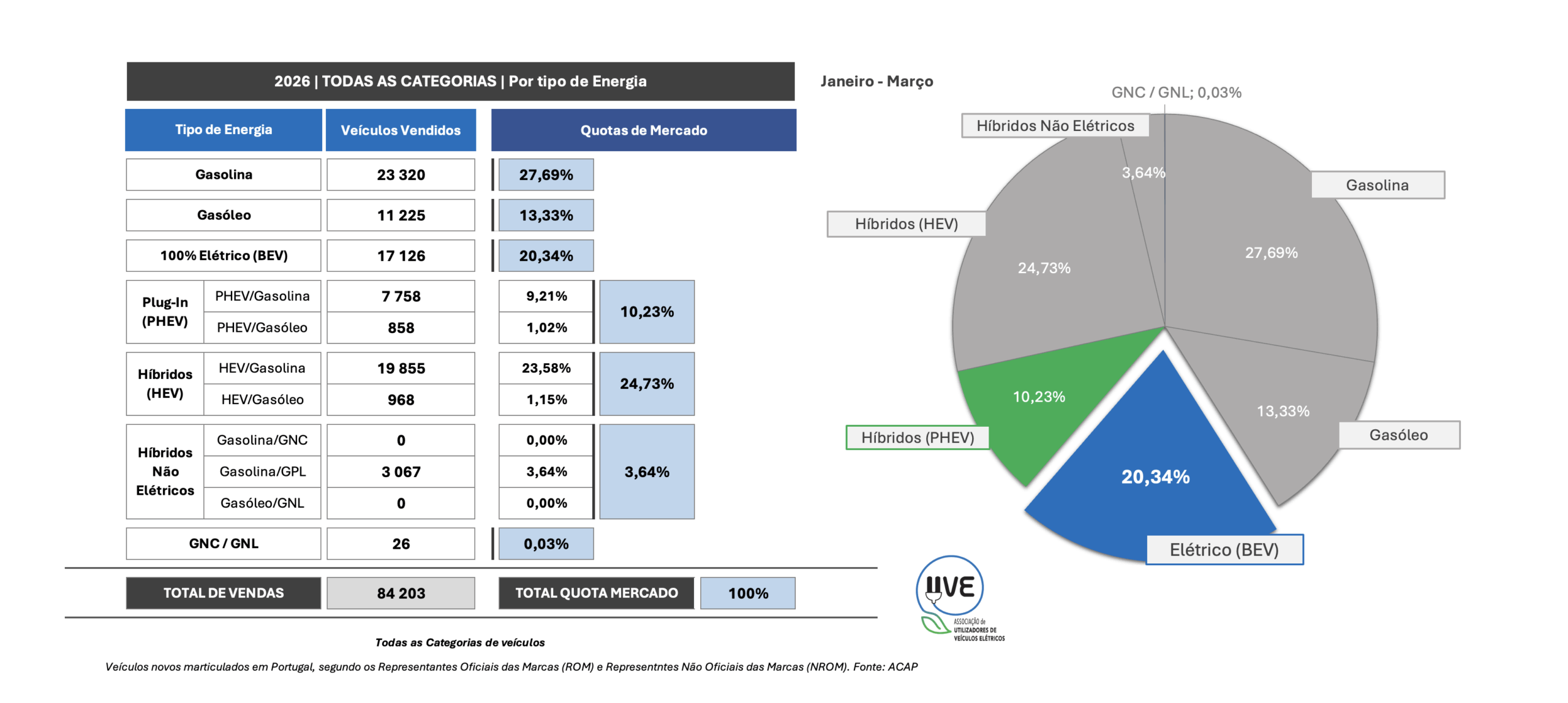 Todas as categorias de veículos, novos, por tipo de energia, matriculados em Portugal em março de 2026 e a respetiva quota.