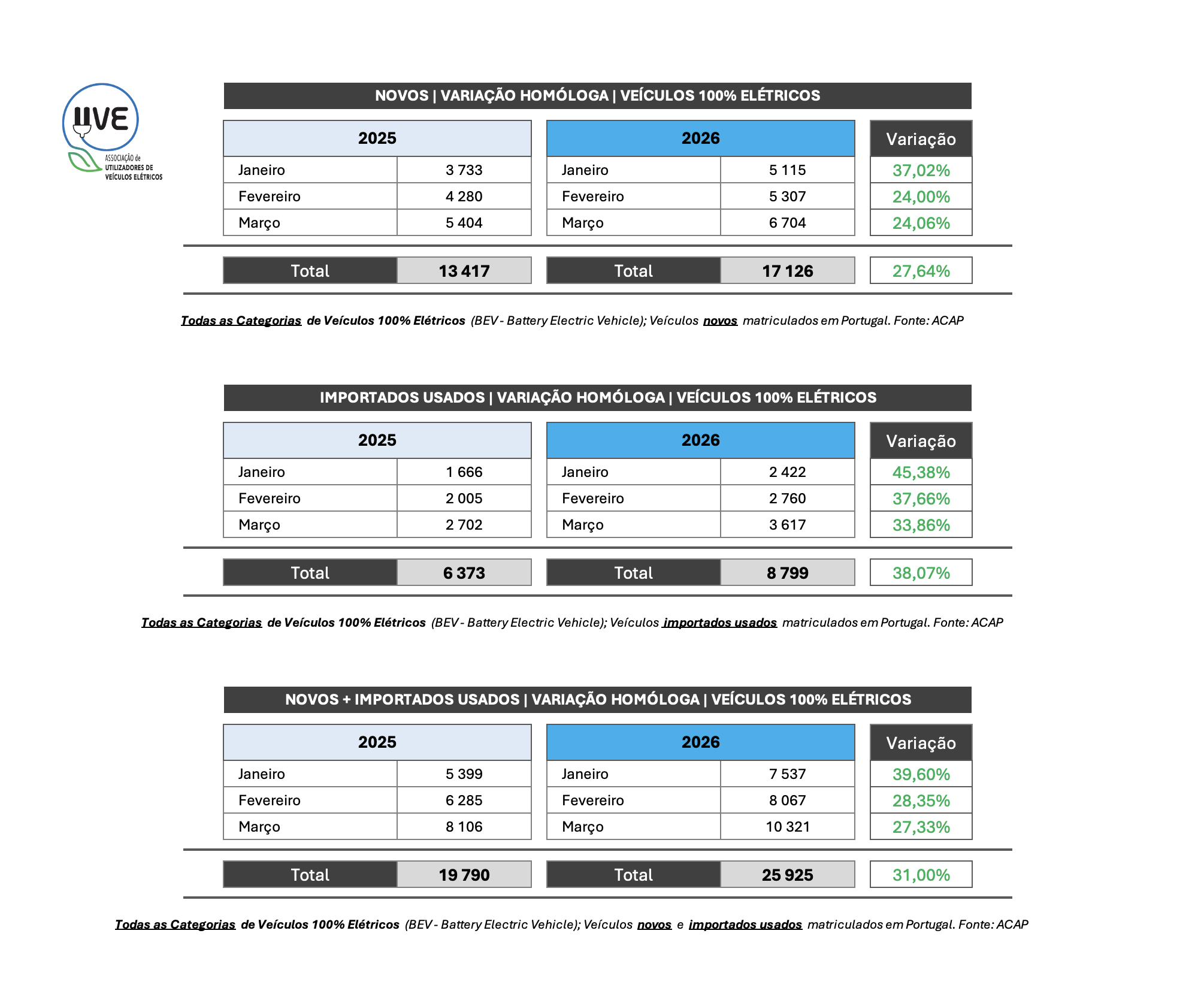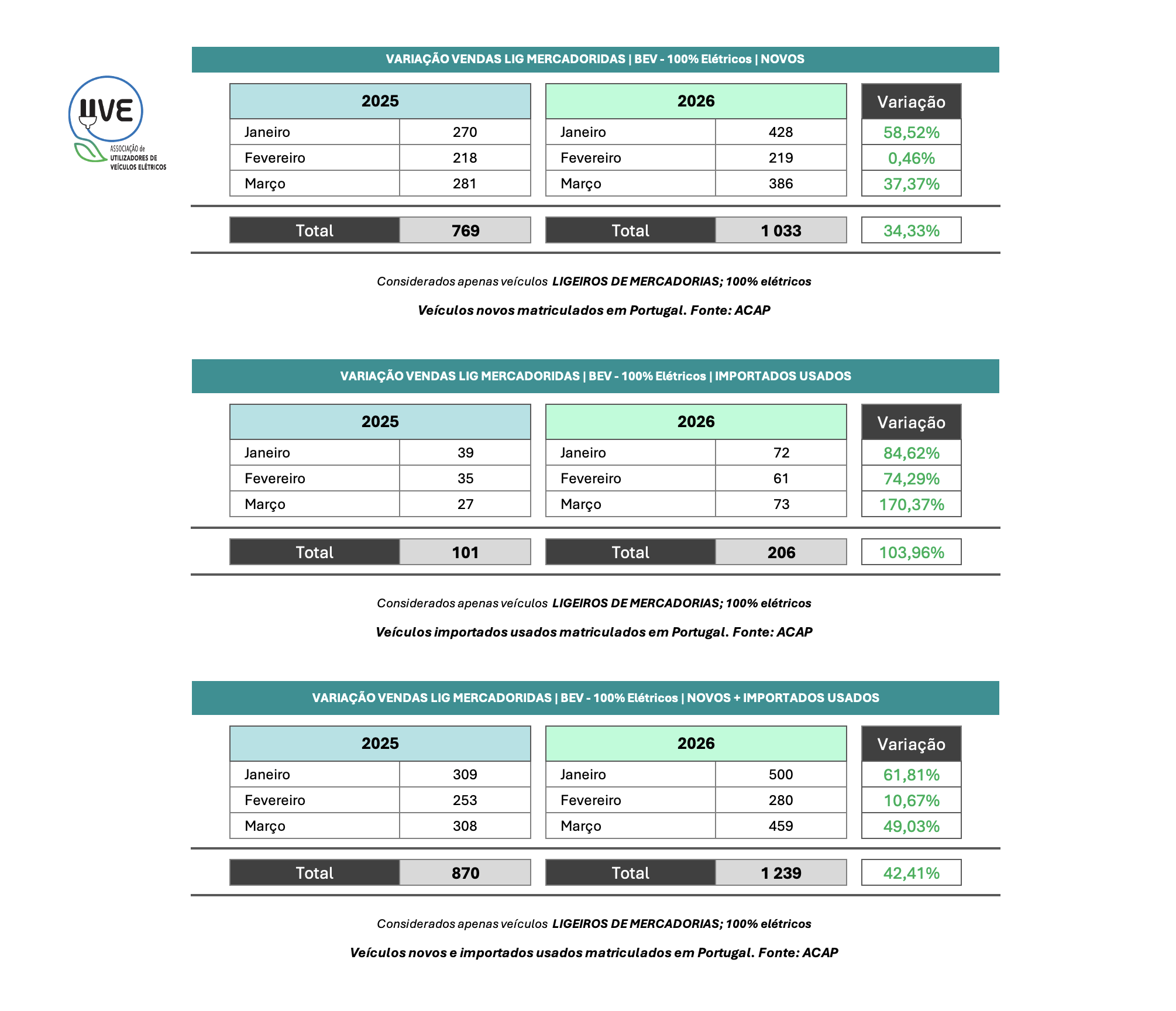 Variação homóloga de veículos 100% elétricos (BEV – Battery Electric Vehicle), ligeiros de mercadorias, novos e importados usados.