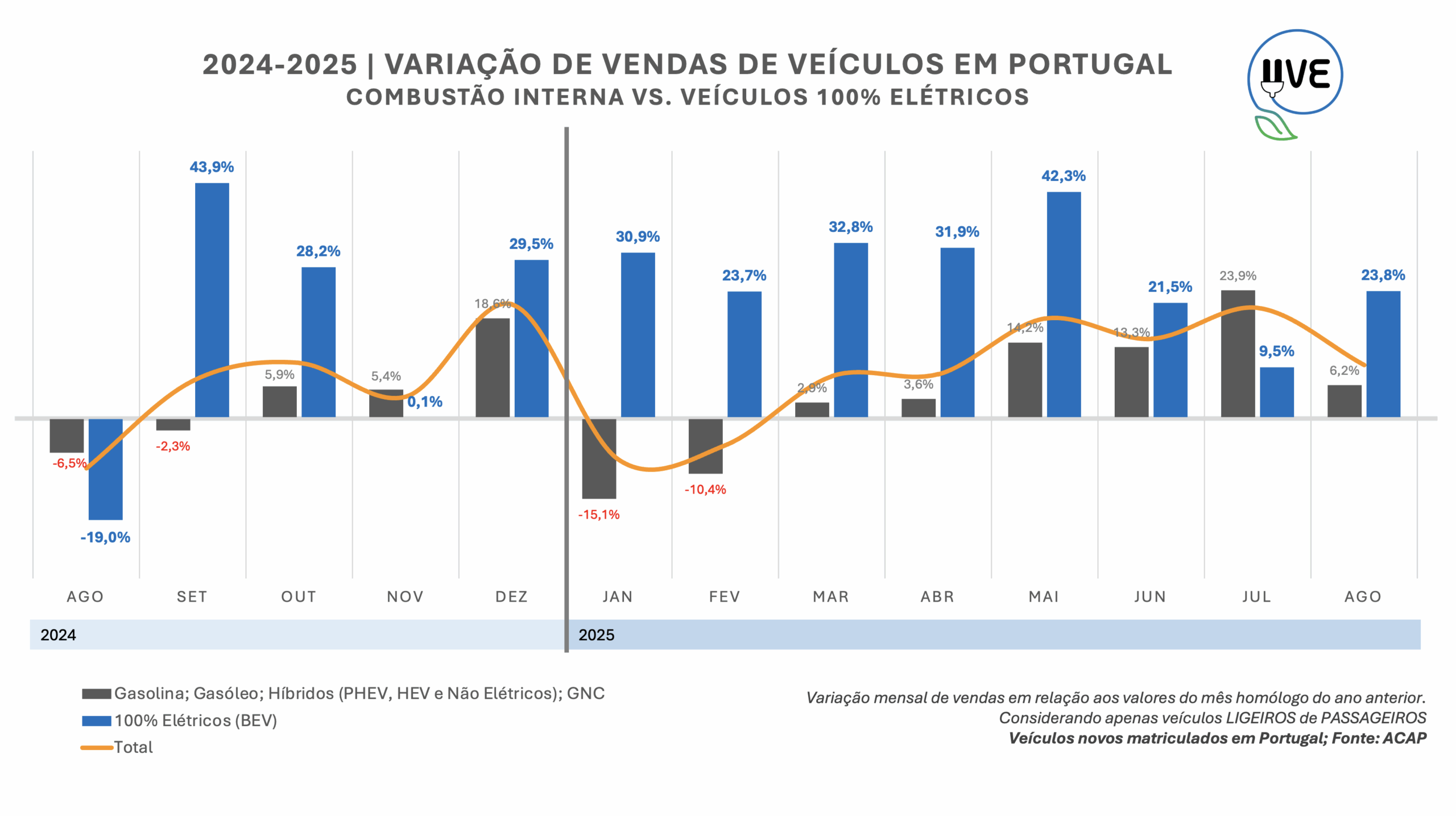 O mês de agosto é, normalmente, um mês que se caracteriza por uma redução do número de vendas de veículos novos, na ordem dos 20% face ao mês de julho. Este ano, a redução verificada foi de 21%, contudo, quando restringimos a veículos 100% elétricos, a redução foi de apenas 11%, mostrando assim a maior resiliência deste mercado.