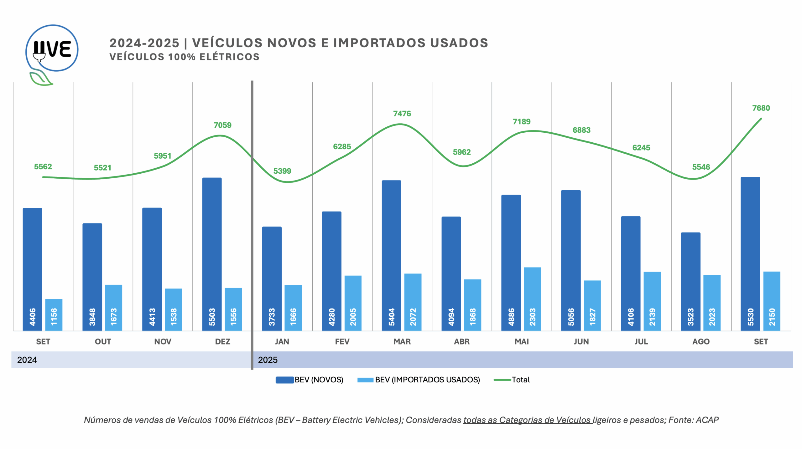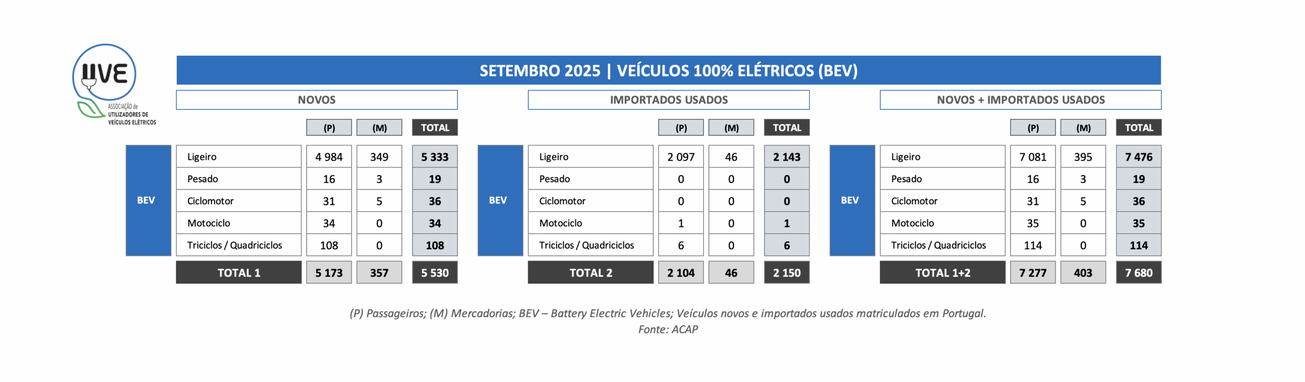 Veículos 100% elétricos (BEV – Battery Electric Vehicle) de todas as categorias, novos e importados usados, matriculados durante o mês de setembro em Portugal. Total de 7.680, dos quais 5.530 correspondem a veículos novos e 2.150 de veículos importados usados.