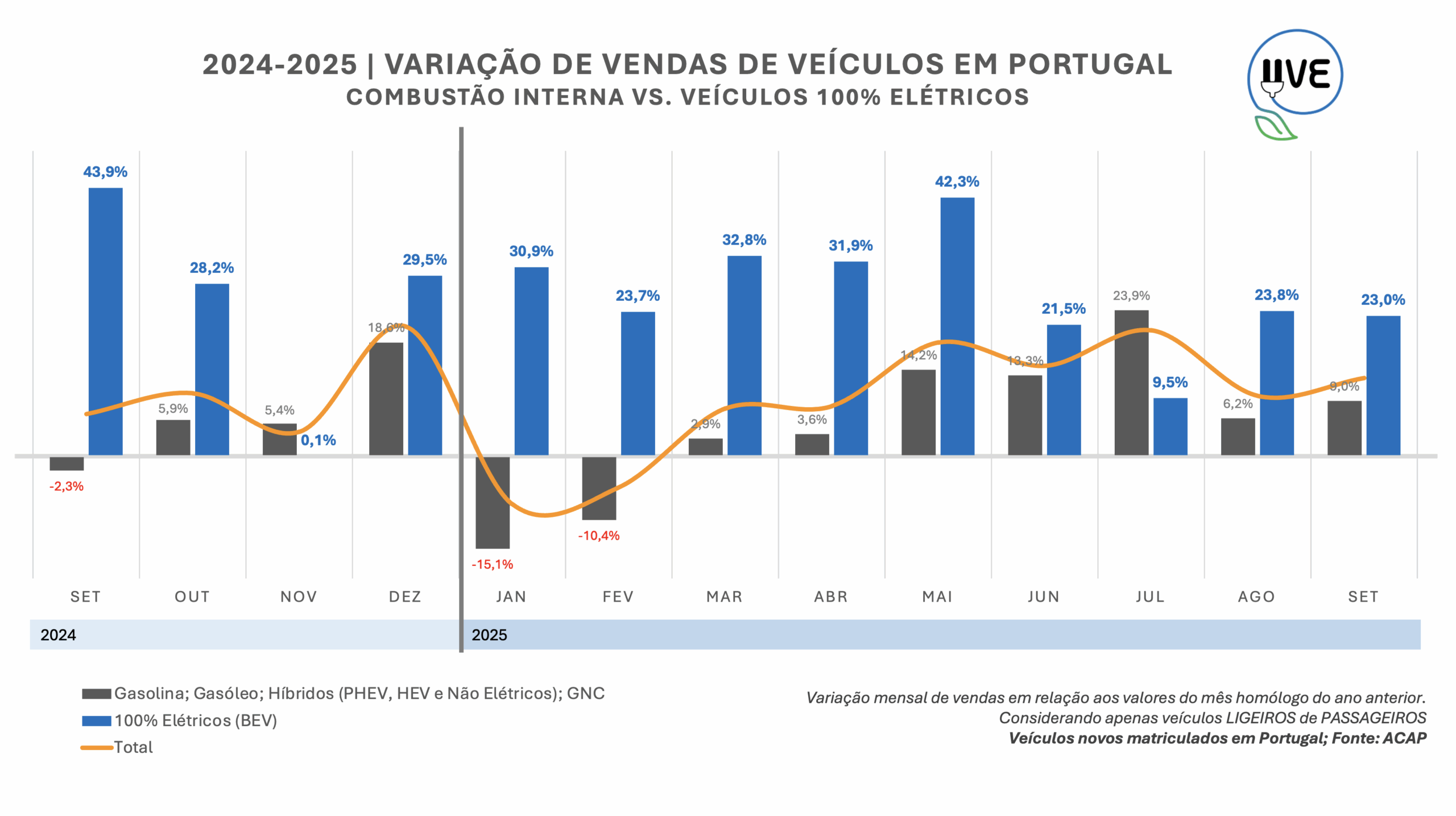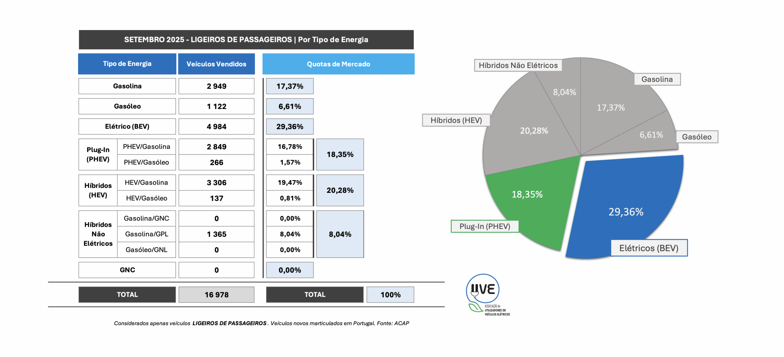Pela primeira vez em Portugal, os veículos 100% elétricos ultrapassam o total de veículos a combustão (gasolina e gasóleo). No mês de setembro de 2025, o total de veículos novos, ligeiros de passageiros, 100% elétricos, matriculados em Portugal ultrapassaram o total acumulado entre os veículos a gasolina e gasóleo. Foram matriculados em Portugal 4.984 veículos novos, ligeiros de passageiros, 100% elétricos e 4.071 veículos novos exclusivamente movidos a motor a combustão – a gasolina (2.949) ou a gasóleo (1.122).