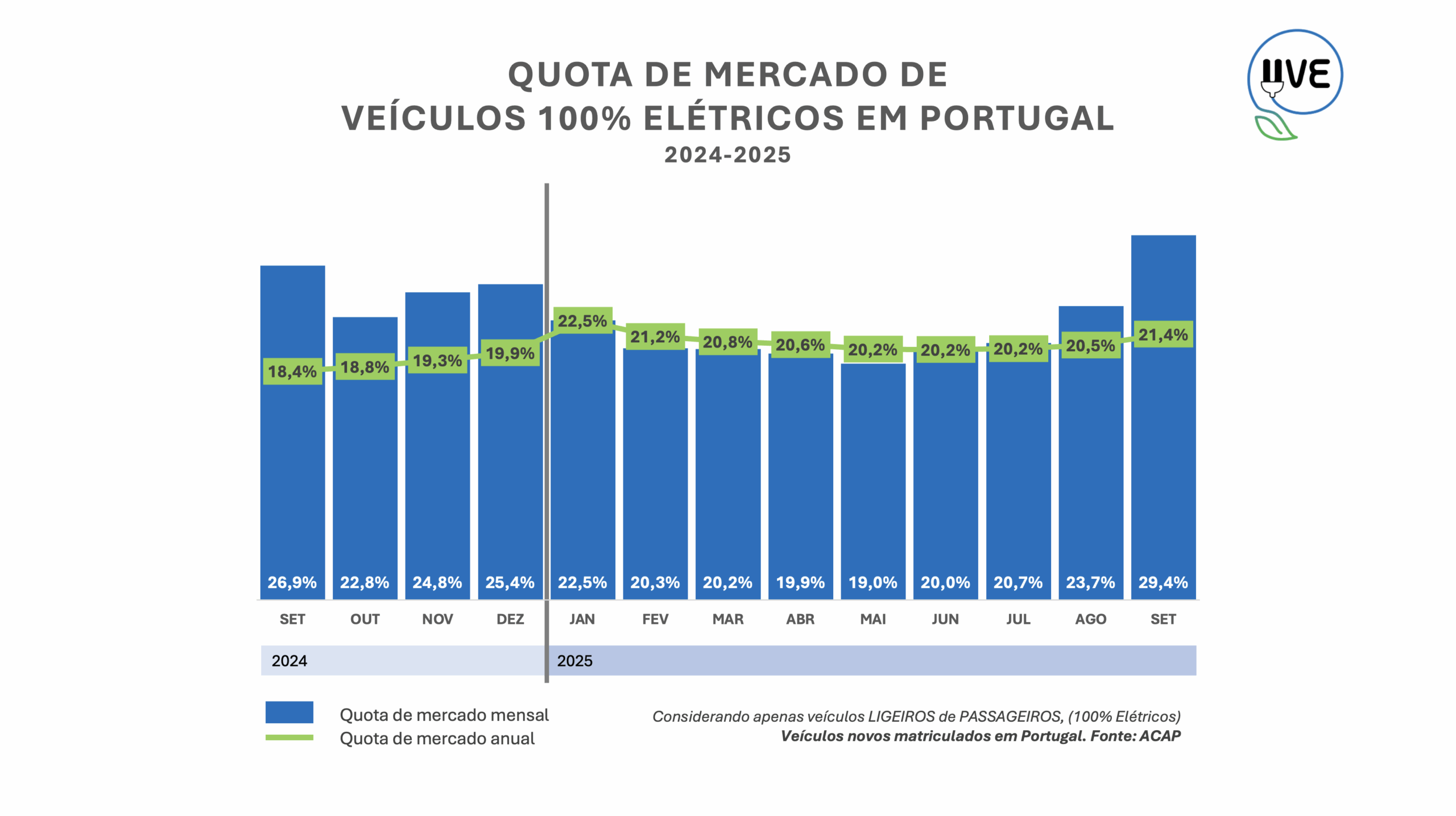 • Recorde de quota de mercado (mensal): Os veículos 100% elétricos representam 29,36% dos veículos ligeiros de passageiros, novos, matriculados em Portugal no mês de setembro de 2025.