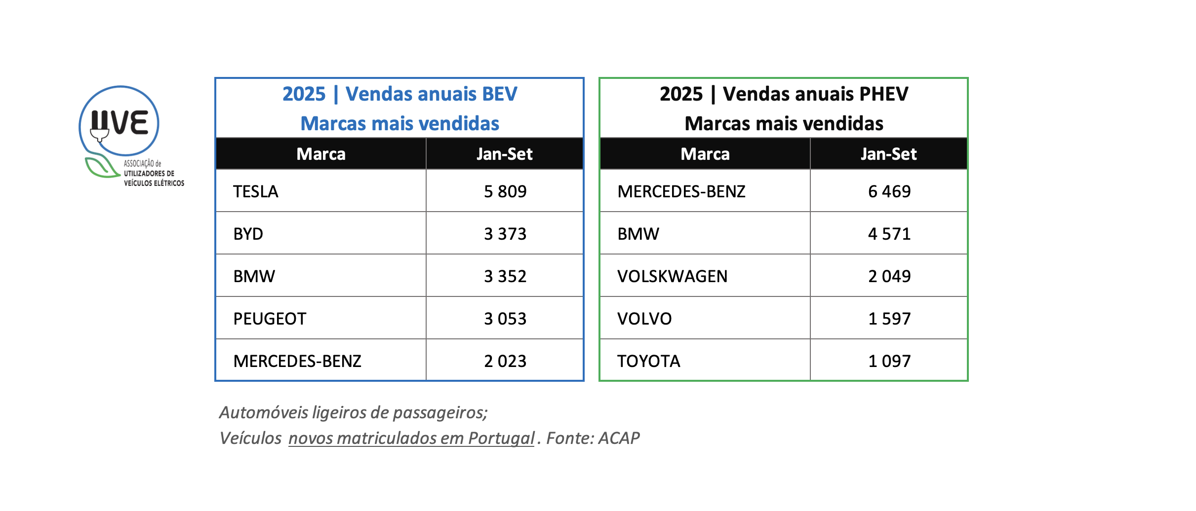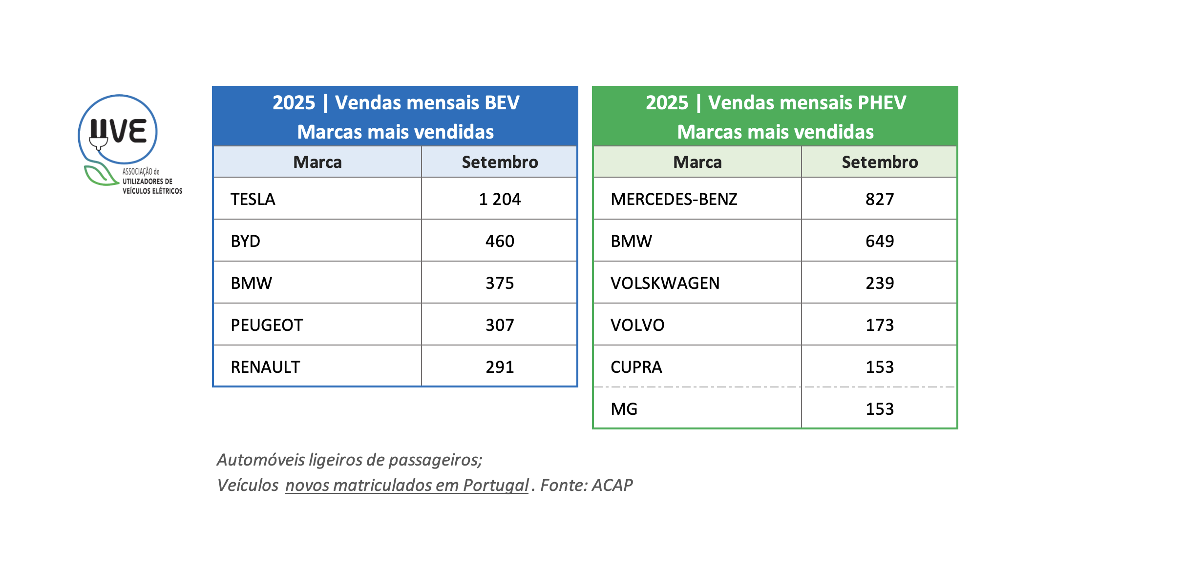 Top das marcas de veículos ligeiros de passageiros, 100% elétricos (BEV – Battery Electric Vehicle) e híbridos plug-in (PHEV – Plug-In Hybrid Electric Vehicle), novos, matriculados em Portugal no mês de setembro de 2025.