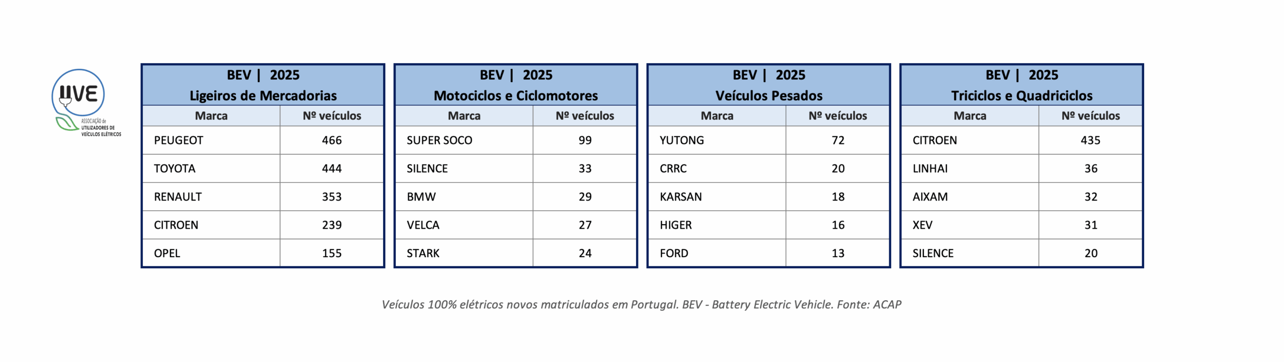 Top de marcas de veículos novos ligeiros de mercadorias, veículos pesados de mercadorias e/ou passageiros, motociclos e ciclomotores e triciclos e quadriciclos 100% elétricos (BEV – Battery Electric Vehicle), matriculados em Portugal em 2025.