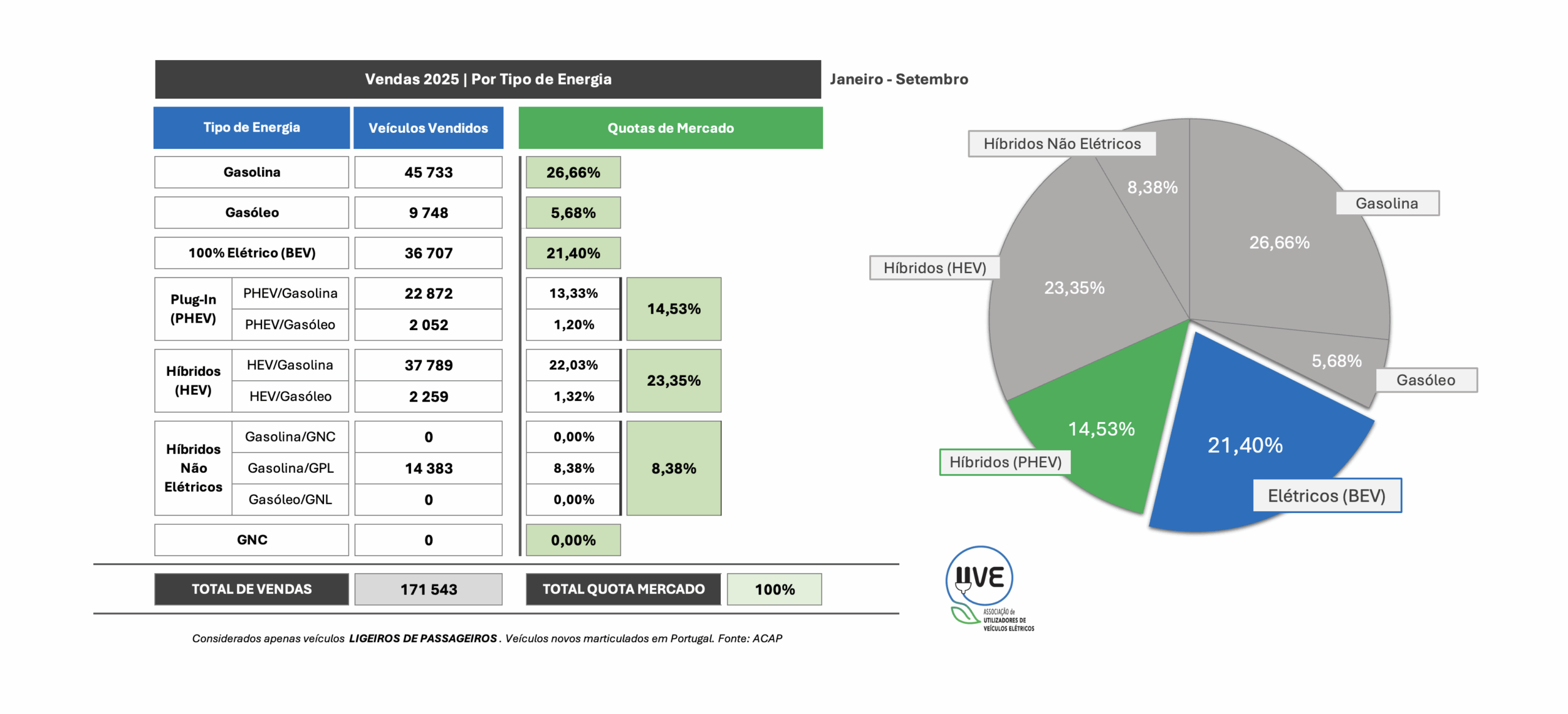 Todas as categorias de veículos, novos, por tipo de energia, matriculados em Portugal desde o início do ano de 2025 e a respetiva quota.