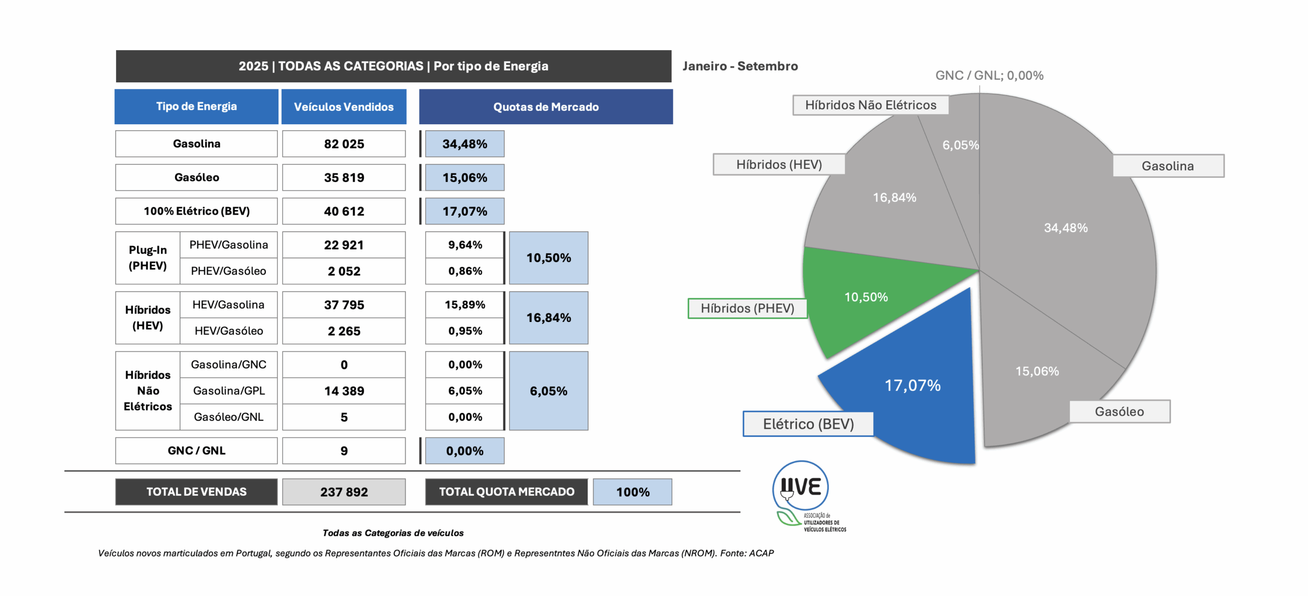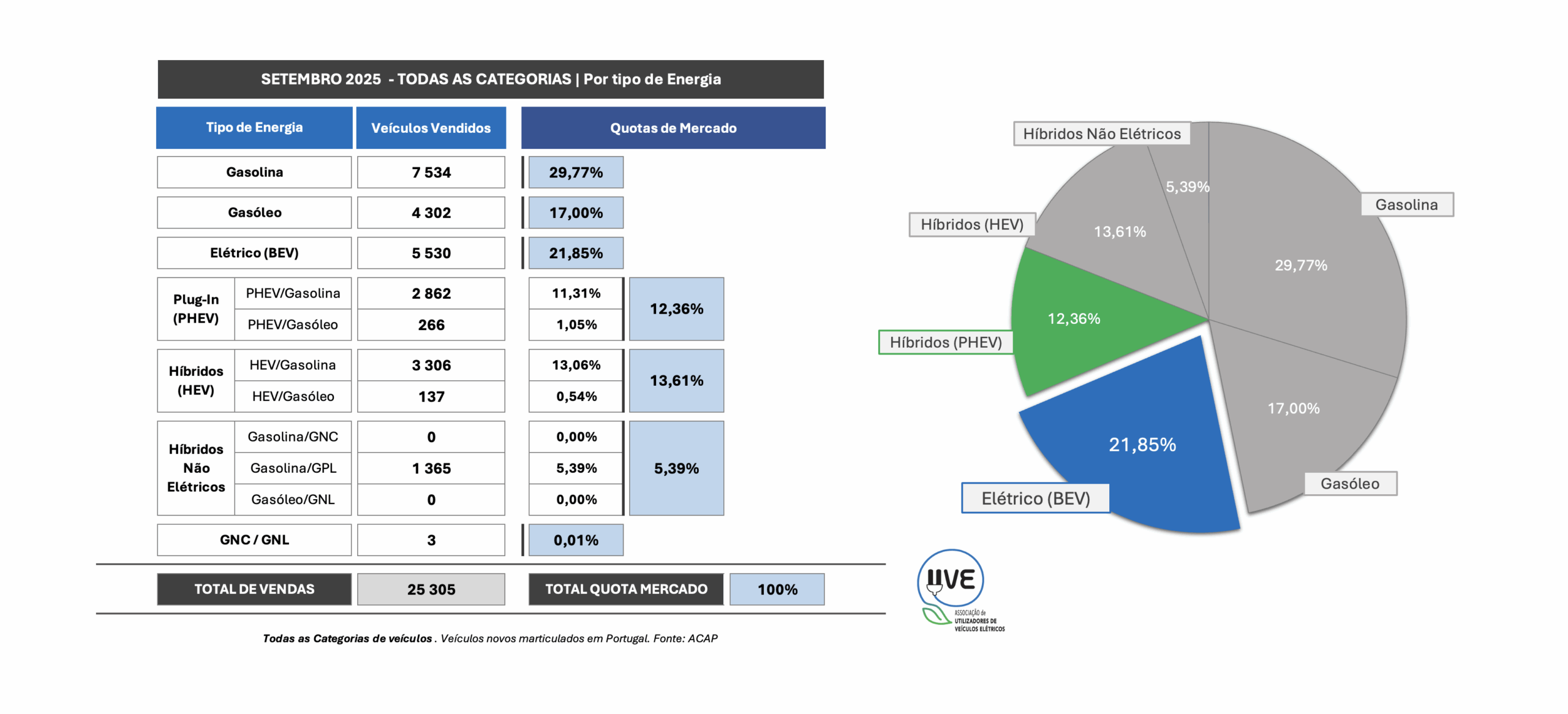 Todas as categorias de veículos, novos, por tipo de energia, matriculados em Portugal em setembro de 2025 e a respetiva quota.