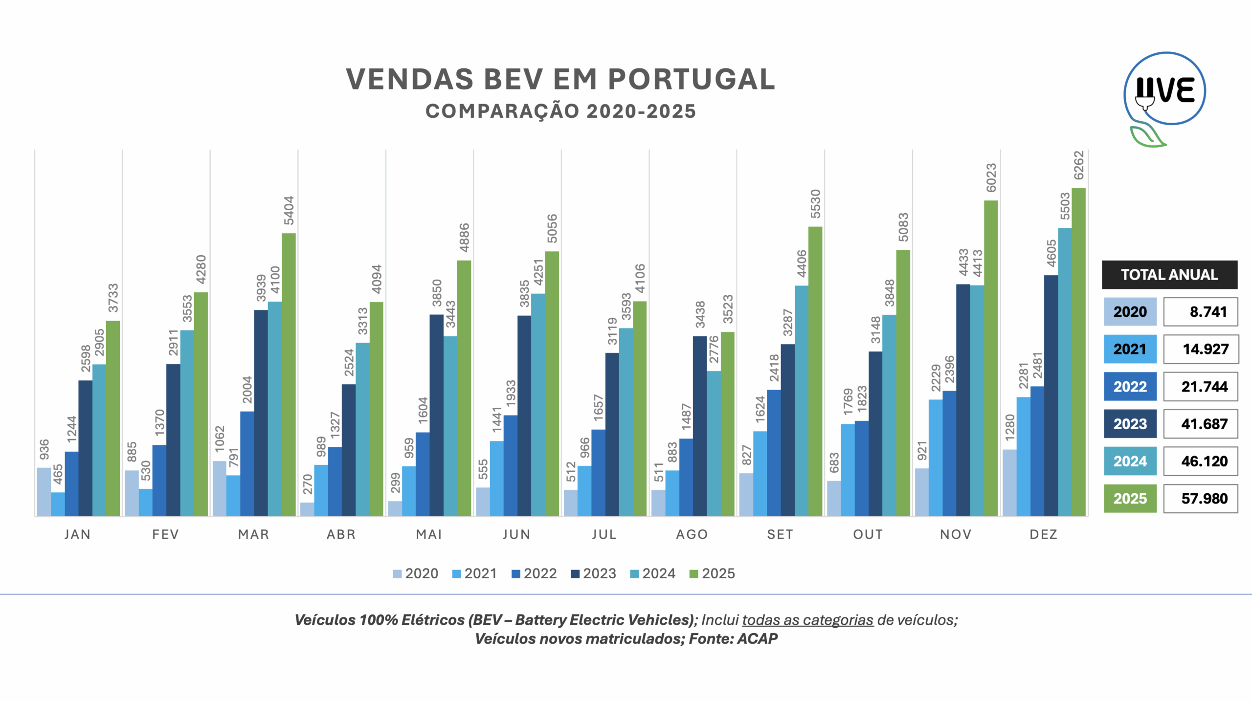 O mês de dezembro de 2025 voltou a marcar um momento histórico para a mobilidade elétrica em Portugal, com um novo recorde absoluto de matrículas de veículos 100% elétricos. Ao longo do mês foram matriculados 8.746 veículos 100% elétricos, dos quais 6.262 correspondem a veículos novos e 2.484 a veículos importados usados.
