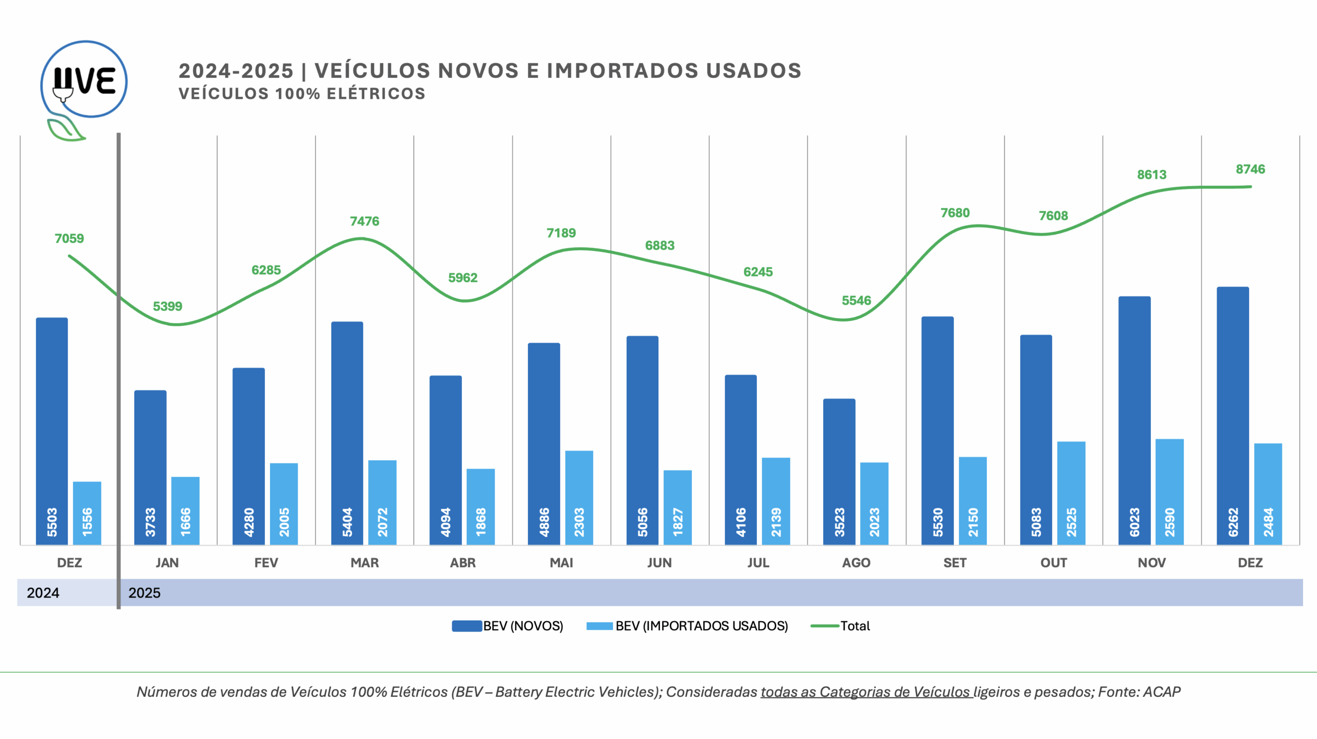 Veículos 100% elétricos (BEV – Battery Electric Vehicle) de todas as categorias, novos e importados usados, matriculados durante o mês de novembro em Portugal. Total de 8.746, dos quais 6.262 correspondem a veículos novos e 2.484 de veículos importados usados.