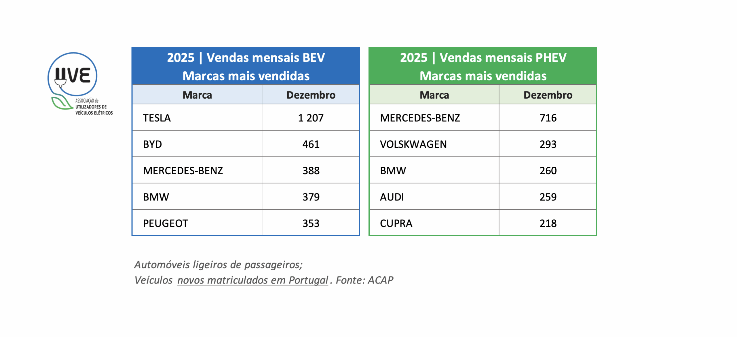 Top das marcas de veículos ligeiros de passageiros, 100% elétricos (BEV – Battery Electric Vehicle) e híbridos plug-in (PHEV – Plug-In Hybrid Electric Vehicle), novos, matriculados em Portugal no mês de dezembro de 2025.