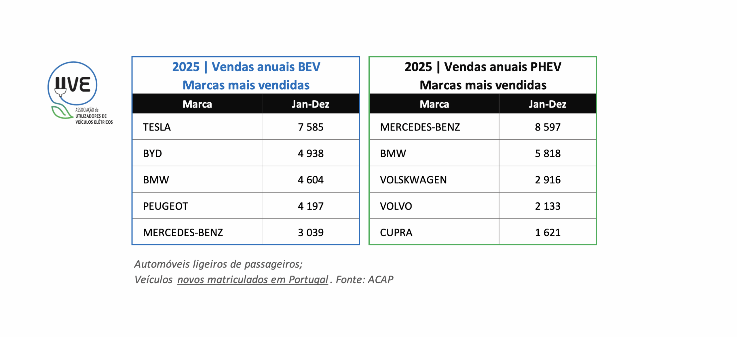Top das marcas de veículos ligeiros de passageiros, 100% elétricos (BEV – Battery Electric Vehicle) e híbridos plug-in (PHEV – Plug-In Hybrid Electric Vehicle), novos, matriculados em Portugal no ano de 2025.