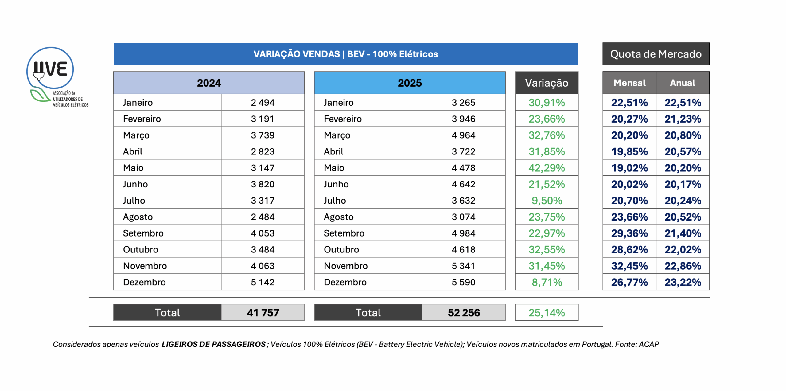 Evolução da quota mensal e anual de veículos ligeiros de passageiros, novos, 100% elétricos (BEV – Battery Electric Vehicle), matriculados em Portugal.
