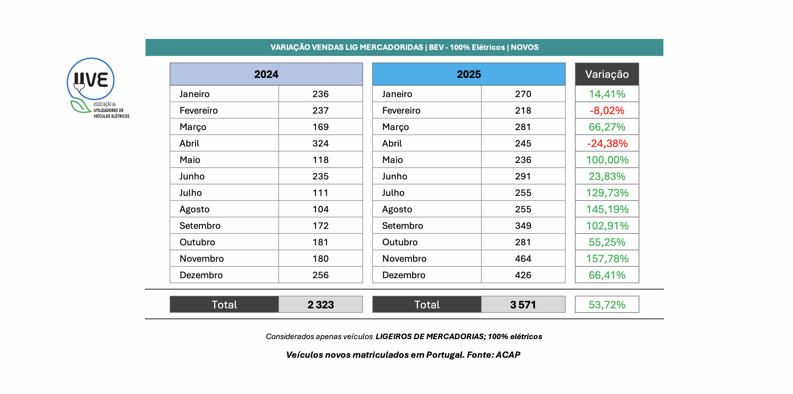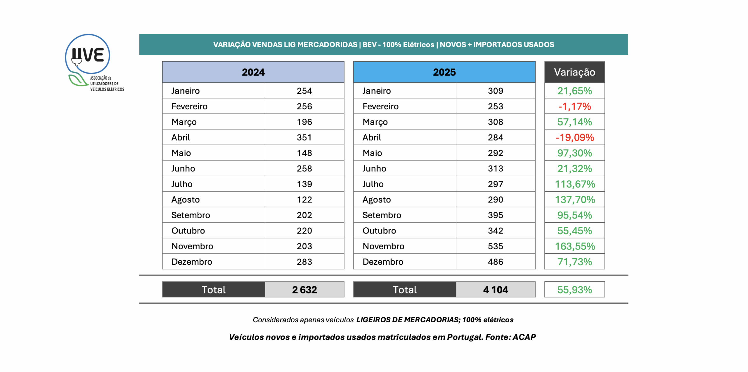 Variação homóloga de veículos 100% elétricos (BEV – Battery Electric Vehicle), ligeiros de mercadorias, novos e importados usados, matriculados em Portugal.