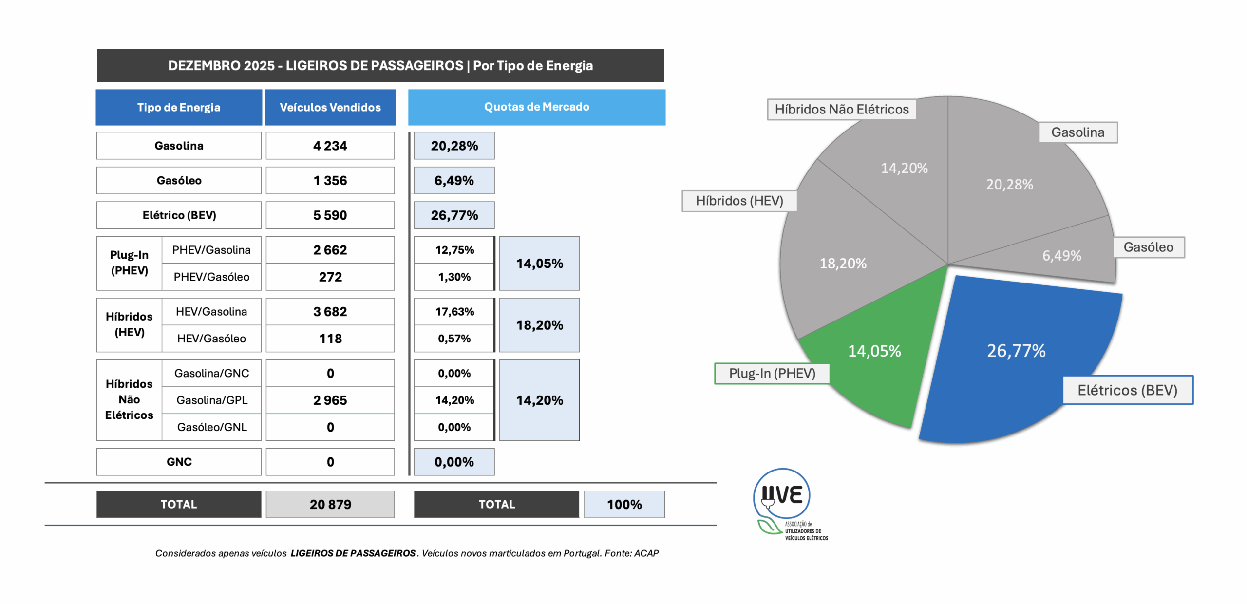 No segmento dos ligeiros de passageiros, os 100% elétricos lideraram o mercado com 26,77% de quota, seguidos pelos veículos a gasolina com 20,28%, os híbridos (HEV) alcançaram 18,20%, os híbridos não elétricos 14,20%, os híbridos plug-in (PHEV) 14,05%, enquanto o gasóleo continua em queda acentuada, com apenas 6,49% de quota mensal.