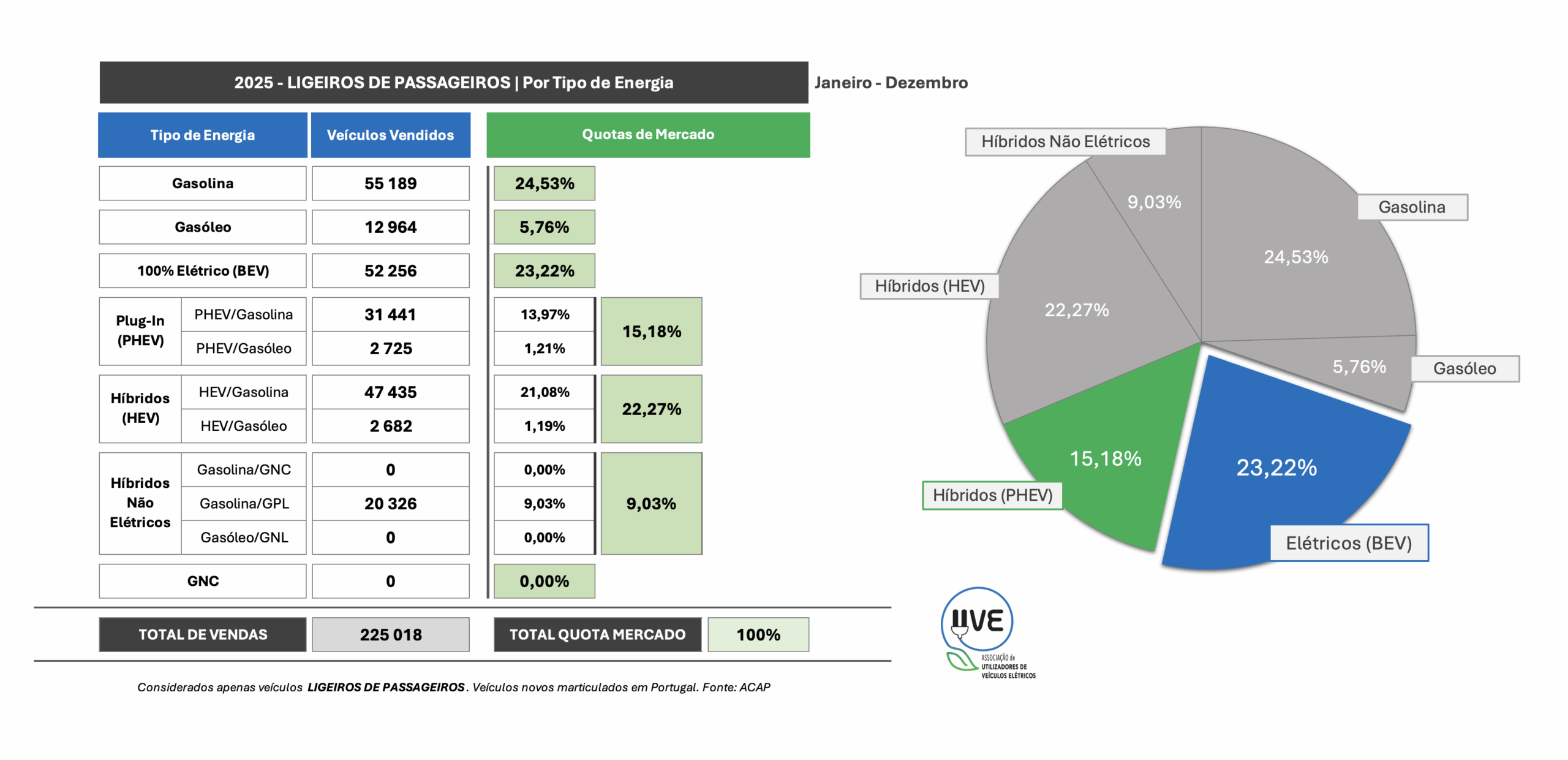 Os veículos 100% elétricos representaram 23,22% da quota anual de mercado de ligeiros de passageiros, um novo máximo histórico, confirmando a preferência crescente dos consumidores portugueses por soluções de mobilidade elétrica.
