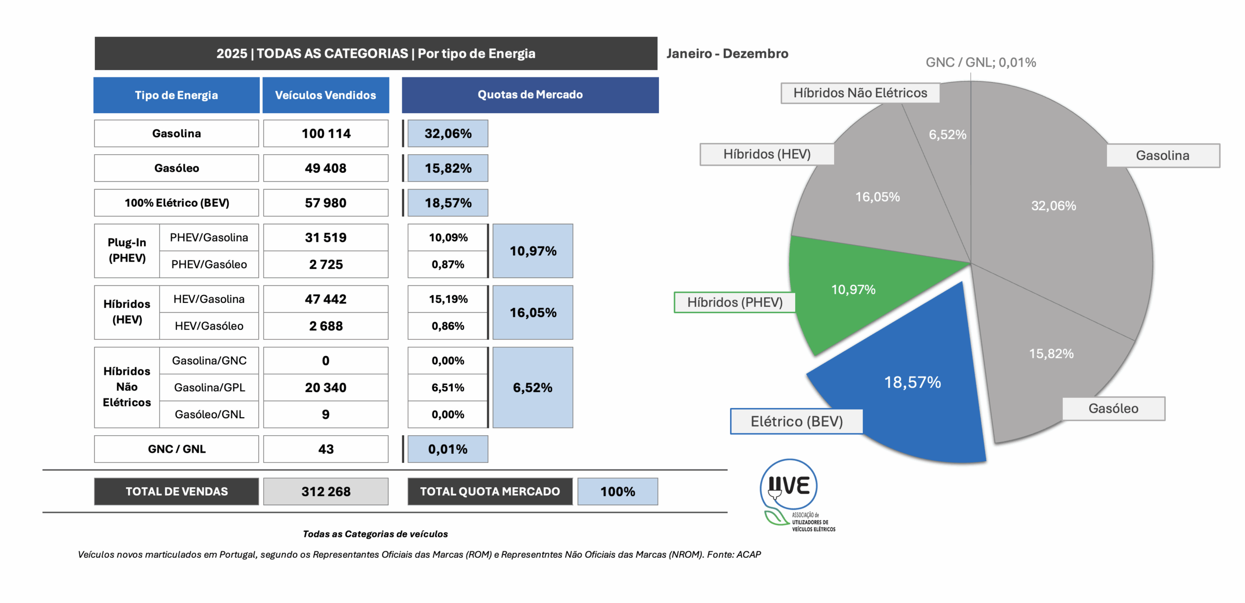 Todas as categorias de veículos, novos, por tipo de energia, matriculados em Portugal desde o início do ano de 2025 e a respetiva quota.