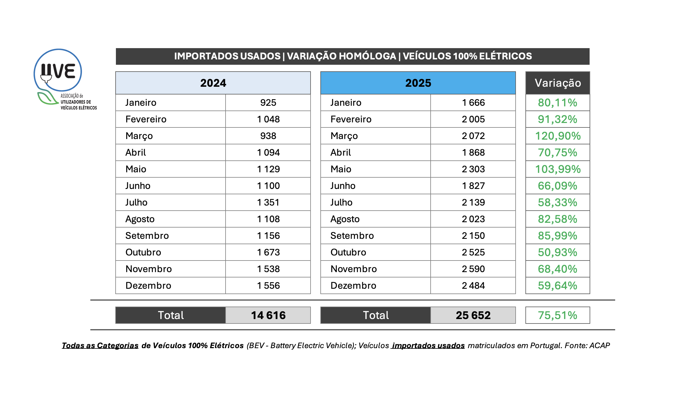 Variação homóloga de veículos 100% elétricos (BEV – Battery Electric Vehicle), novos e importados usados, de todas as categorias matriculados em Portugal.
