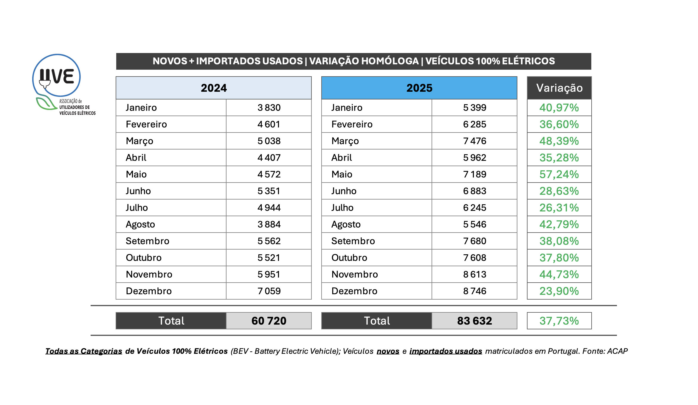 Em termos de variação homóloga, registou-se um crescimento muito expressivo de 23,90% considerando o total de novos e usados. Analisando separadamente, os veículos novos cresceram 13,79%, enquanto os importados usados apresentaram um aumento muito significativo de 59,64%, confirmando o crescente interesse do mercado português por veículos elétricos, também no segmento de veículos em segunda mão importados.